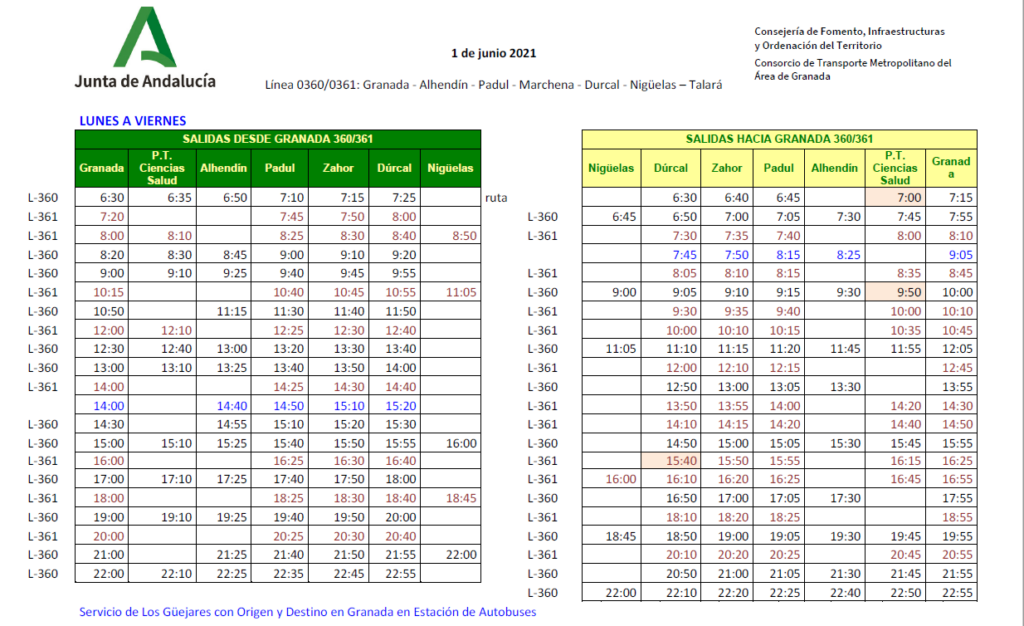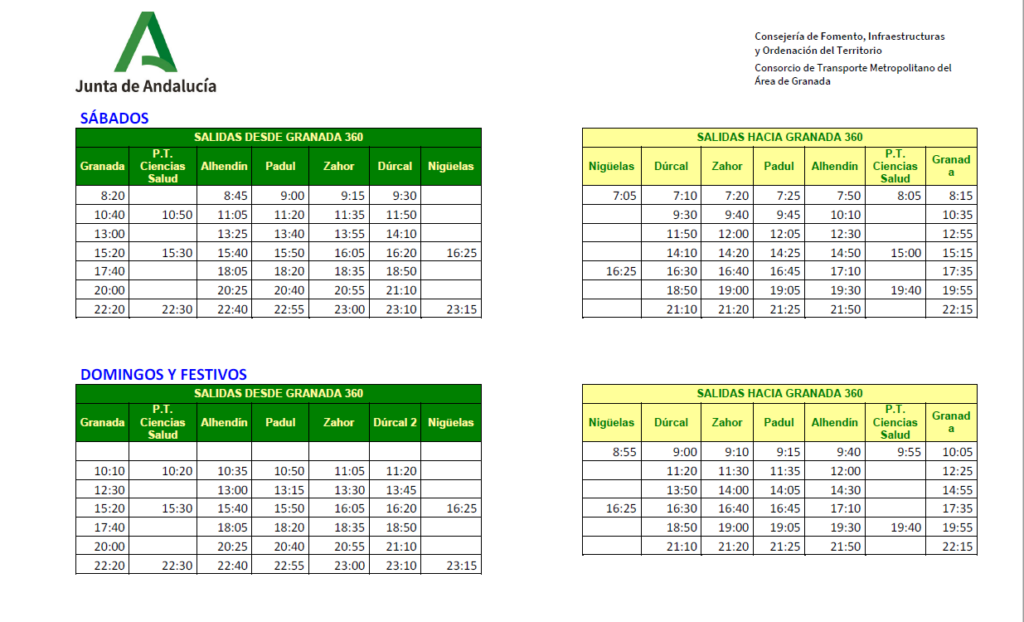 Horarios del autobús que une Granada con Padul, Dúrcal y Nigüelas