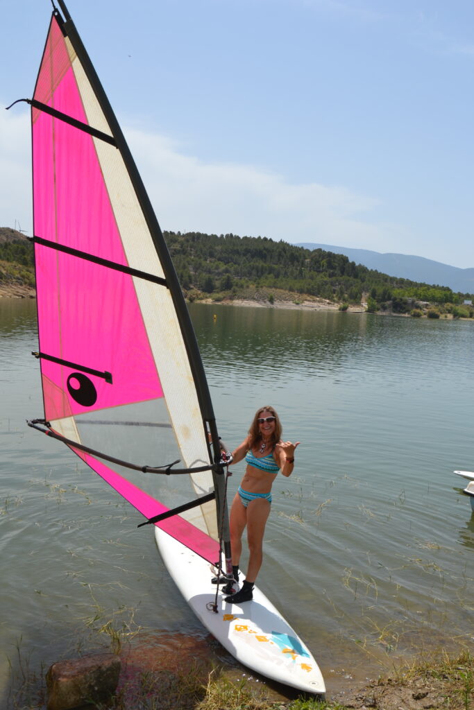 ¿Pero cómo se navega en un embalse? Lo primero que hay que aclarar es que es mucho más fácil realizar cualquier actividad, ya que no hay corrientes, siempre hay orillas cerca y no existe un rompeolas en el que tener problemas. “Aquí casi todo el mundo sale muy contento, y los niños muy felices. Los hay que llegan con la incertidumbre de no saber nada, hacen un curso y sienten la satisfacción de haber logrado navegar. Lo único que tenemos son satisfacciones, por parte de nuestros clientes y de nosotros mismos”, asegura este profesor de Educación Física, fascinado con todo lo que tiene que ver con las actividades náuticas. El agua es el medio natural de esta familia, como lo demuestra Inmaculada encima de una tabla de windsurf con una sonrisa única.