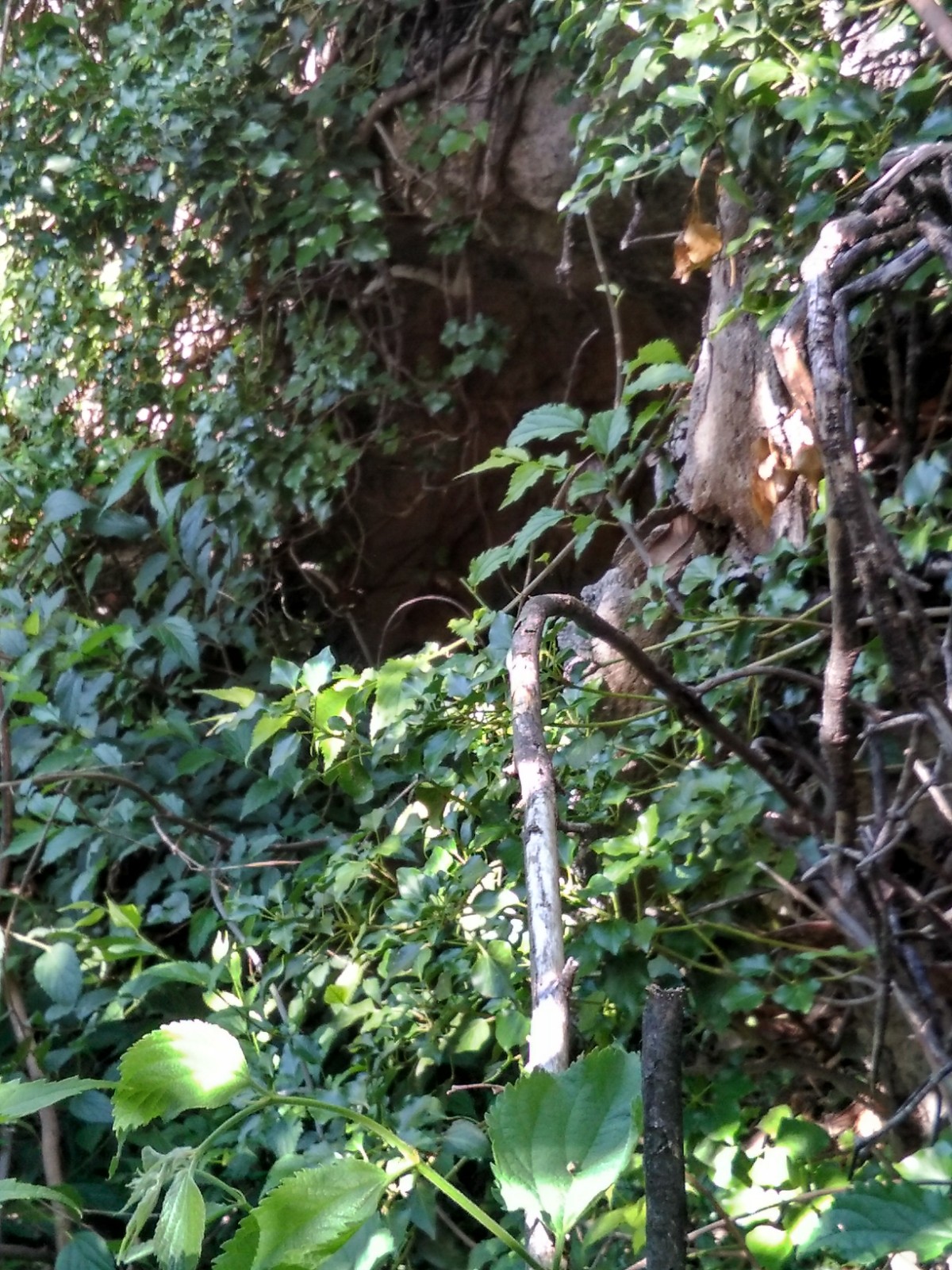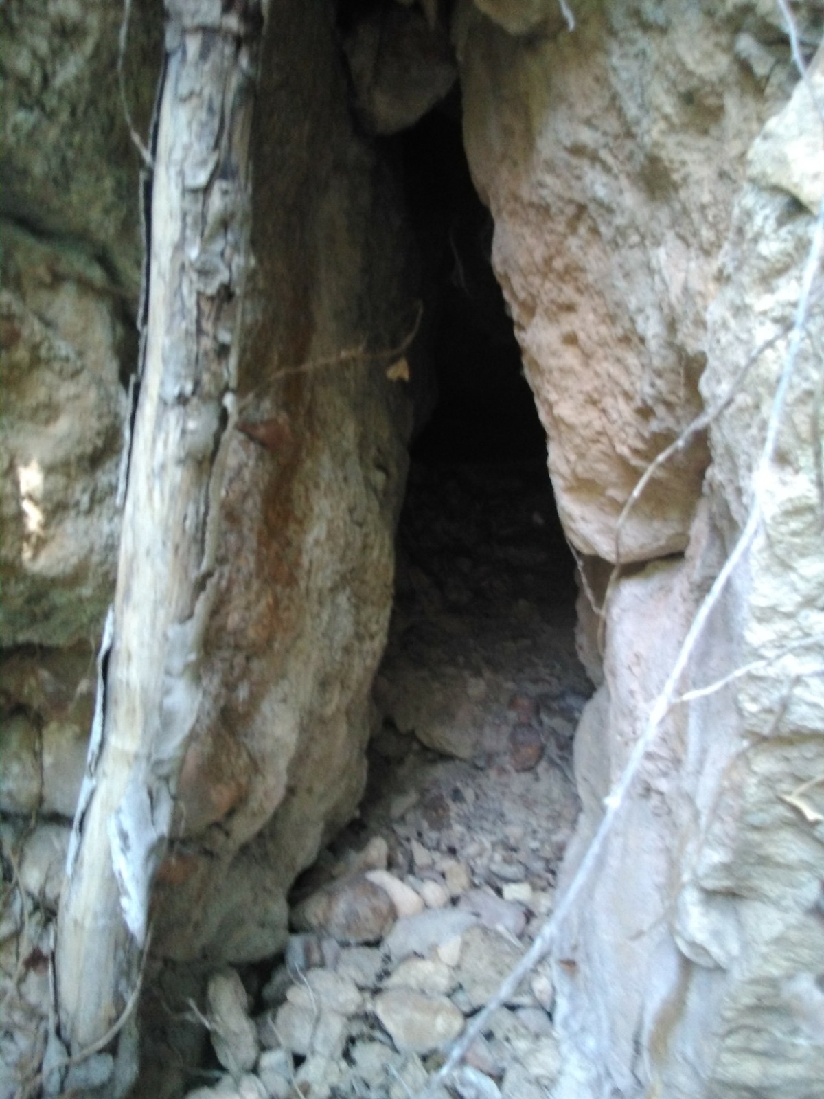 Manuel se asoma al borde y me indica que ahí se ve, yo solo observo maleza, arbustos y a duras penas se adivina una oquedad. Me comenta que en otros tiempos él mantenía una vereda que daba paso hasta el pie de su propiedad y que se podía acceder a la puerta de la galería. Me decido a probar suerte, tronchando ramas de los arbustos para poder vislumbrar el posible camino y consigo llegar a una abertura circular excavada en la pared, que da paso a un espacio entre dos grandes piedras, por donde se penetra hasta dicho túnel, sin atreverme a proseguir mi exploración, ya que me advierte que posiblemente haya derrumbamientos que lo hacen peligroso.