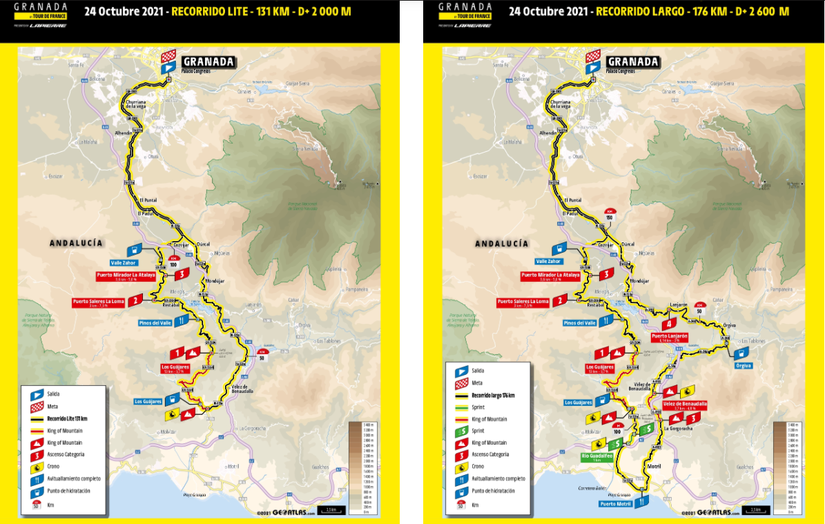 Los dos recorridos comparten salida y parte final, siendo Granada capital el punto en el que coinciden, por ser salida y meta. Será a las 8:00 horas cuando los ciclistas salgan del Paseo del Violón acompañados por un embajador de lujo, Pedro Delgado, para más tarde circular por el puerto del Suspiro del Moro. Por la carretera nacional se dirigirán hasta Dúrcal y Lecrín, donde llegarán hasta Béznar, momento en el que se separan los dos recorridos, el corto y el largo.