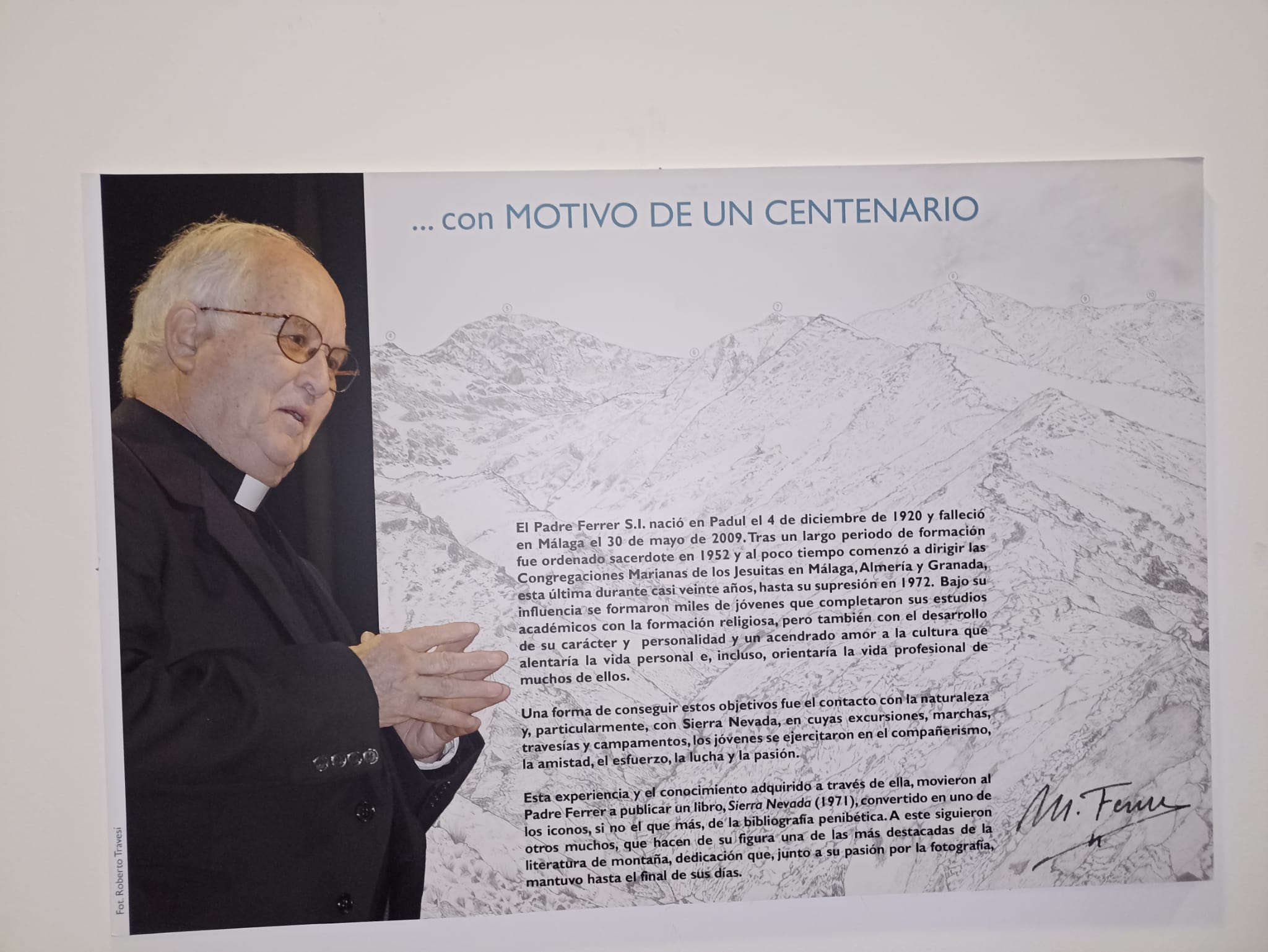 Además, desde hoy y hasta el próximo 12 de diciembre, puede visitarse en el patio del Ayuntamiento de Padul la “Exposición sobre la obra y legado del padre Ferrer”, la muestra recoge paneles que informan sobre su vida y su actividad formativa y montañera incluyendo algunos dibujos originales a plumilla y ampliaciones realizada a partir de las fotografías que han sido donados por la familia a la Biblioteca de Andalucía para su digitalización, conservación y difusión.