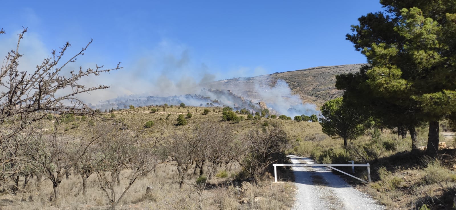 36 bomberos forestales, 3 autobombas y tres autobombas trabajan en estos momentos en la extinción incendio que ha sido declarado este mediodía en la zona de Haza Llana en el término municipal de Lecrín.