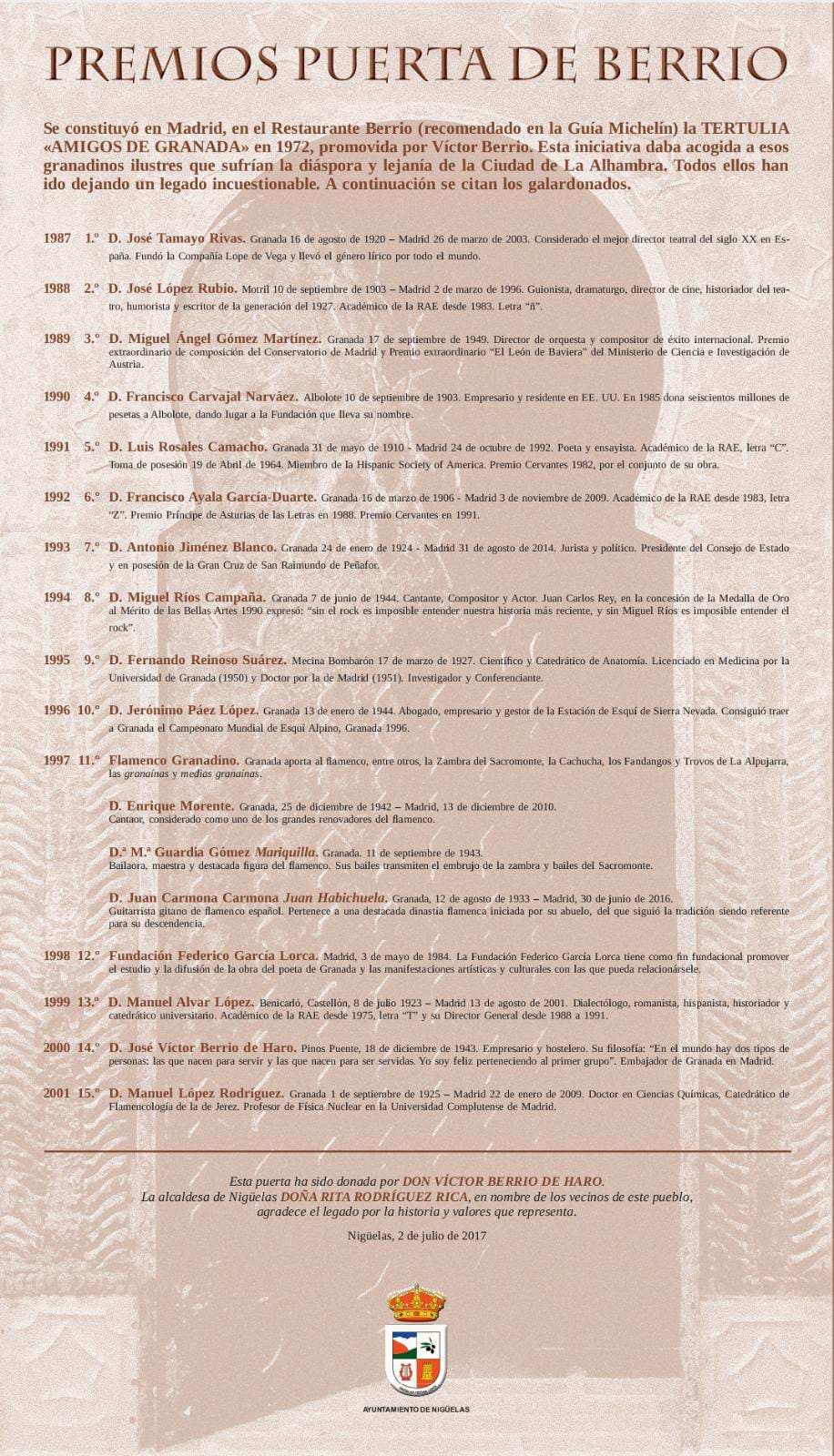 La puerta, “un legado por la historia y valores que representa” en palabras de la alcaldesa Rita Rodríguez fue donada por Víctor Berrio al pueblo de Nigüelas en julio de 2017.