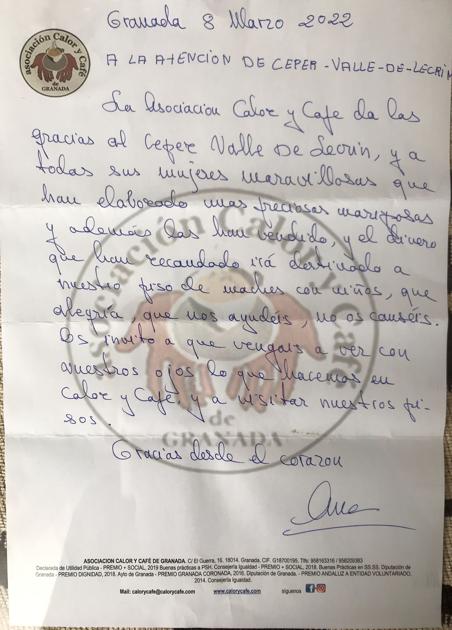 El CEPER Valle de Lecrín hace entrega de 1800 euros a la Asociación “Calor y Café”
