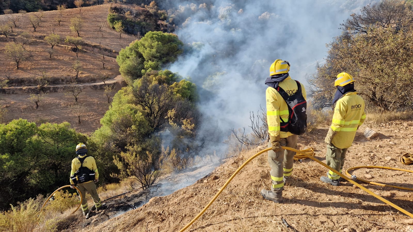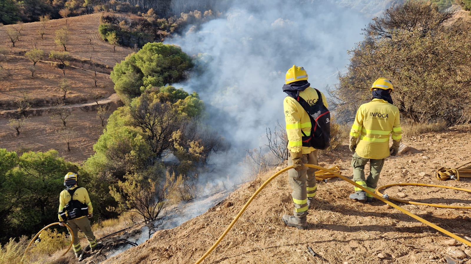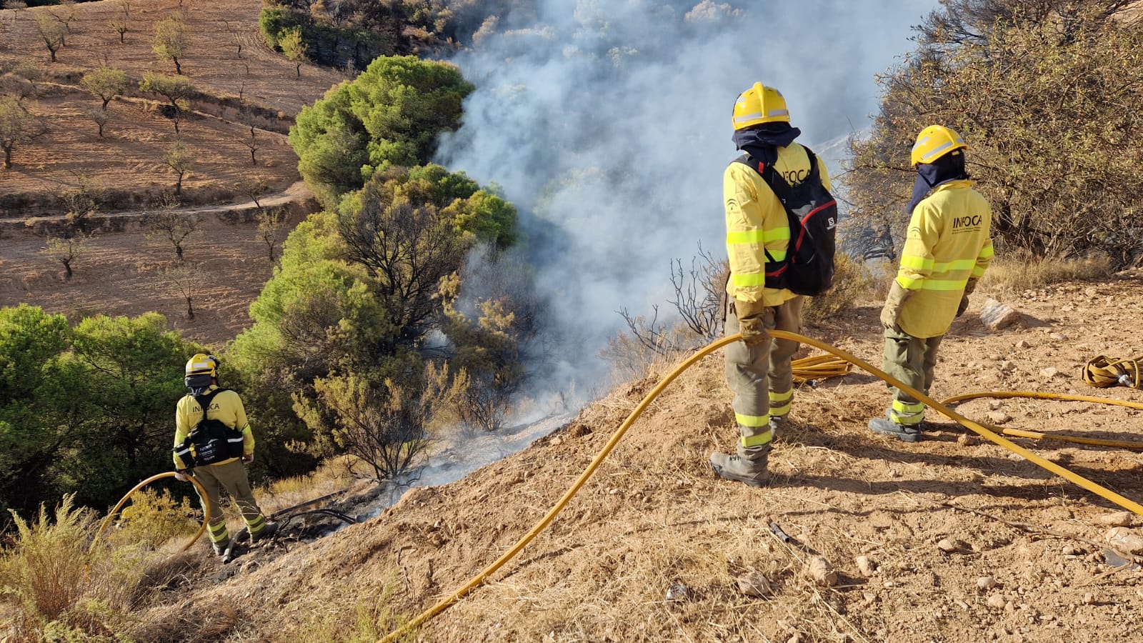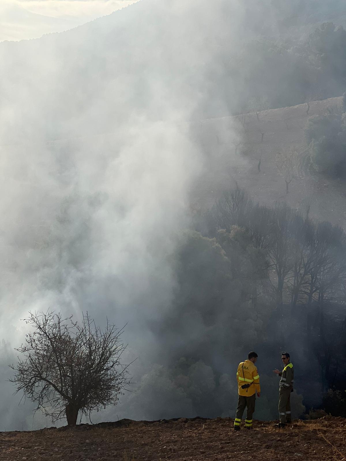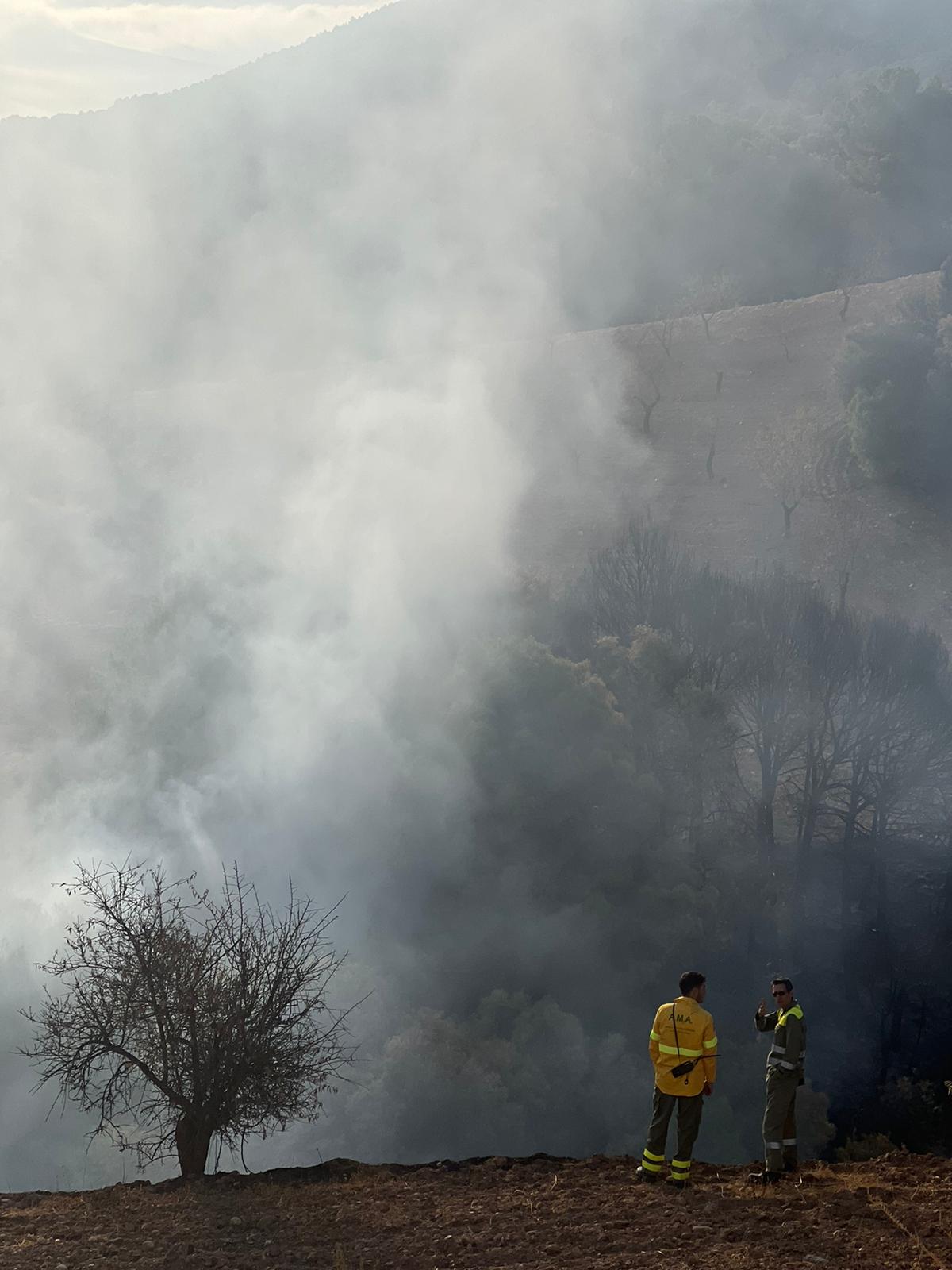 Una veintena de bomberos forestales y un camión de extinción del INFOCA han acudido a la zona donde en este momento trabajan para acabar con las llamas que están ya prácticamente controladas.