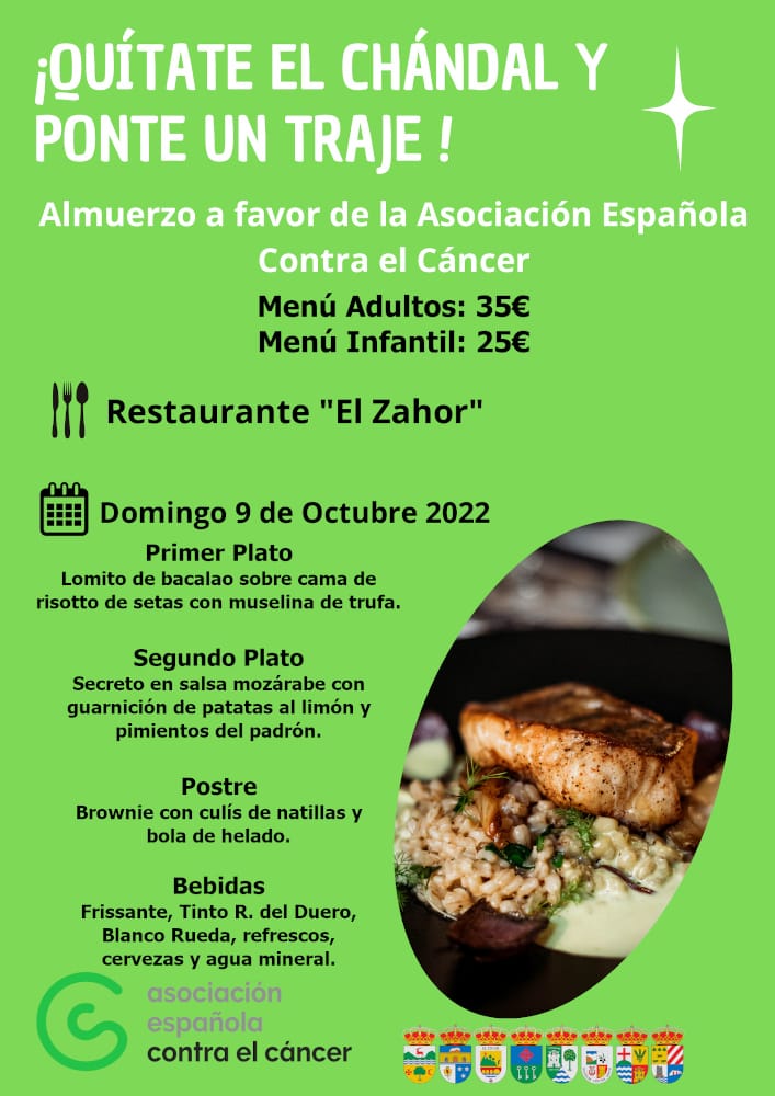 Bajo el lema “quítate el chándal y ponte un traje” animan a todo el mundo a acudir al almuerzo a favor de la asociación española contra el cáncer que han organizado el domingo 9 de octubre en el restaurante el Zahor. Todo lo que se recaude en el almuerzo irá destinado para investigación y para los servicios que presta la asociación y para aumentar la inversión en investigación para que se extienda todos los tipos de cáncer existentes.