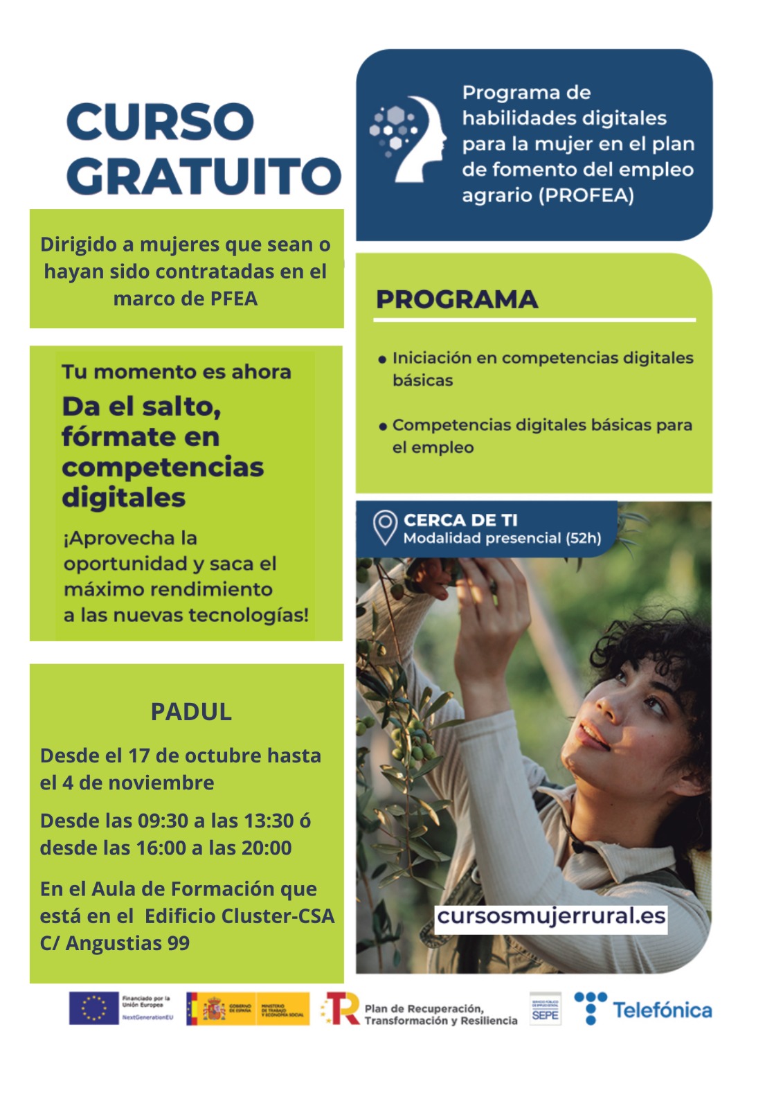 Según ha informado el alcalde de Padul, “más de trescientas mujeres paduleñas están recibiendo estos días información telefónica sobre estos cursos gratuitos de capacitación digital que pone en marcha el Ministerio de Trabajo y que van dirigidos a mujeres contratadas en los planes de fomento del empleo agrario del municipio”.