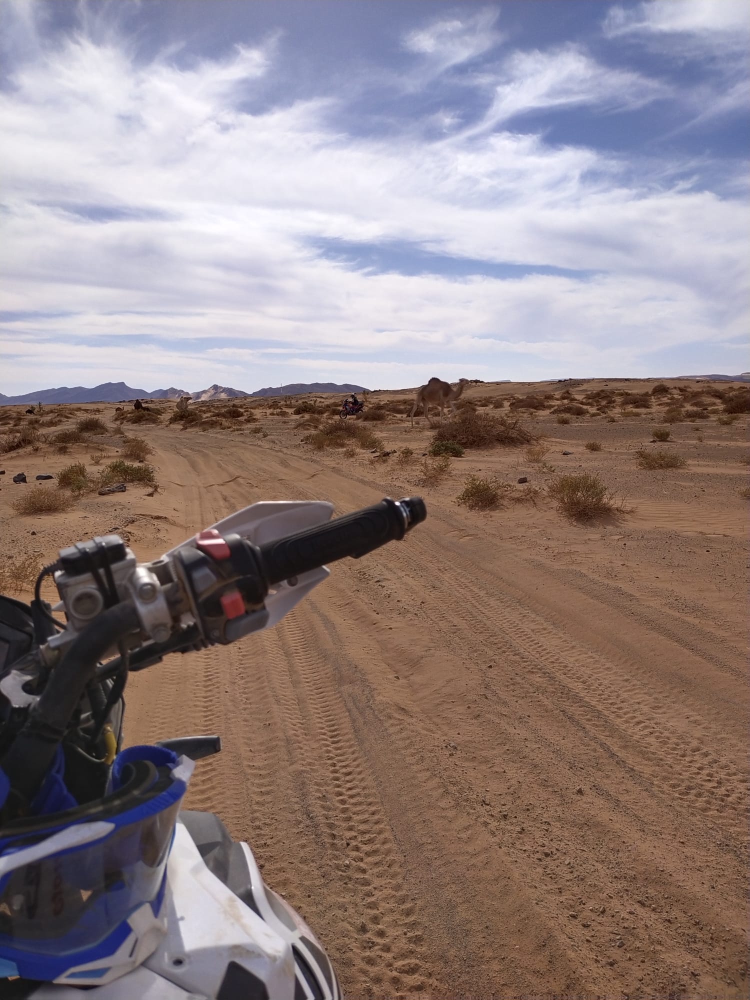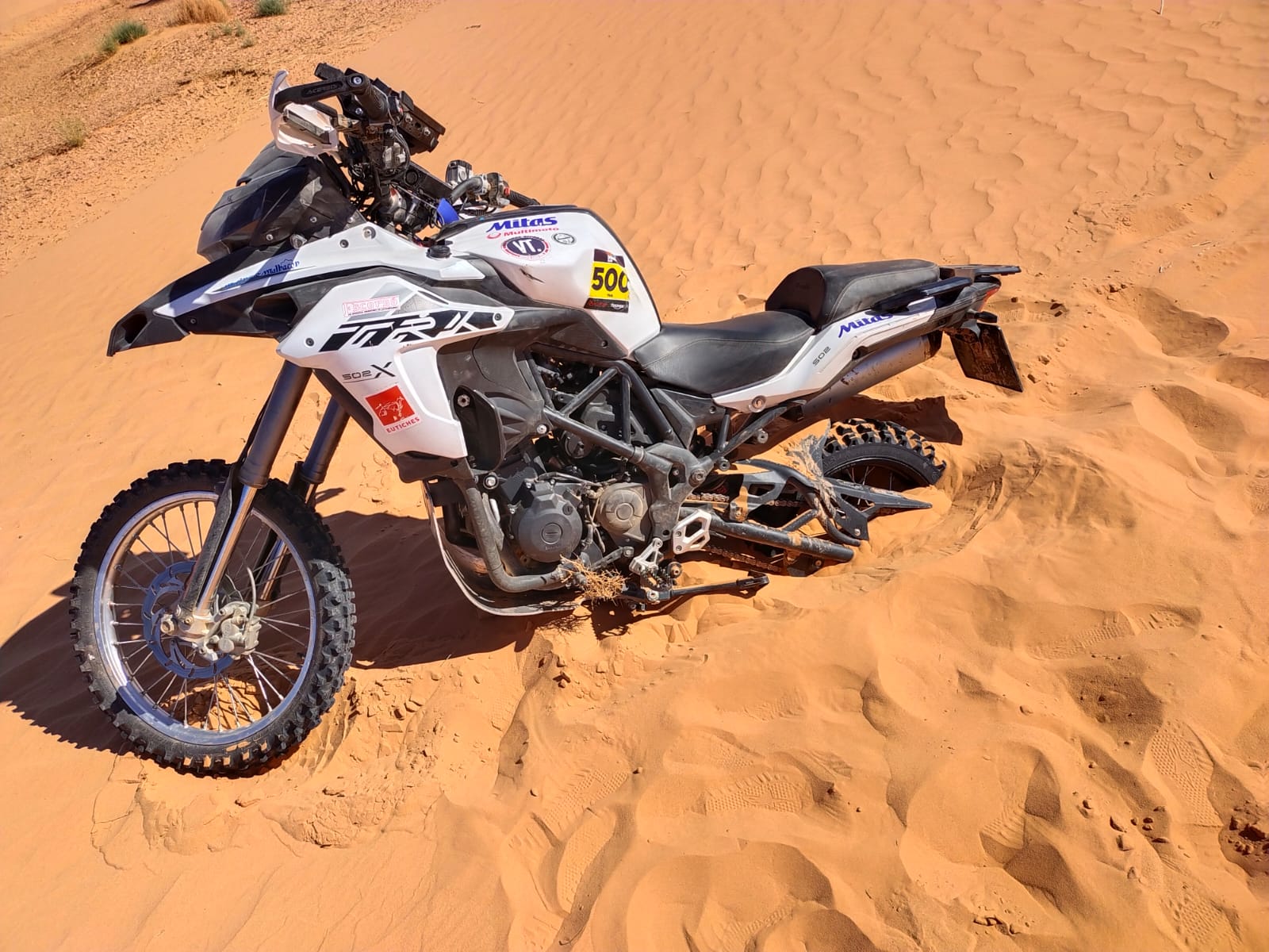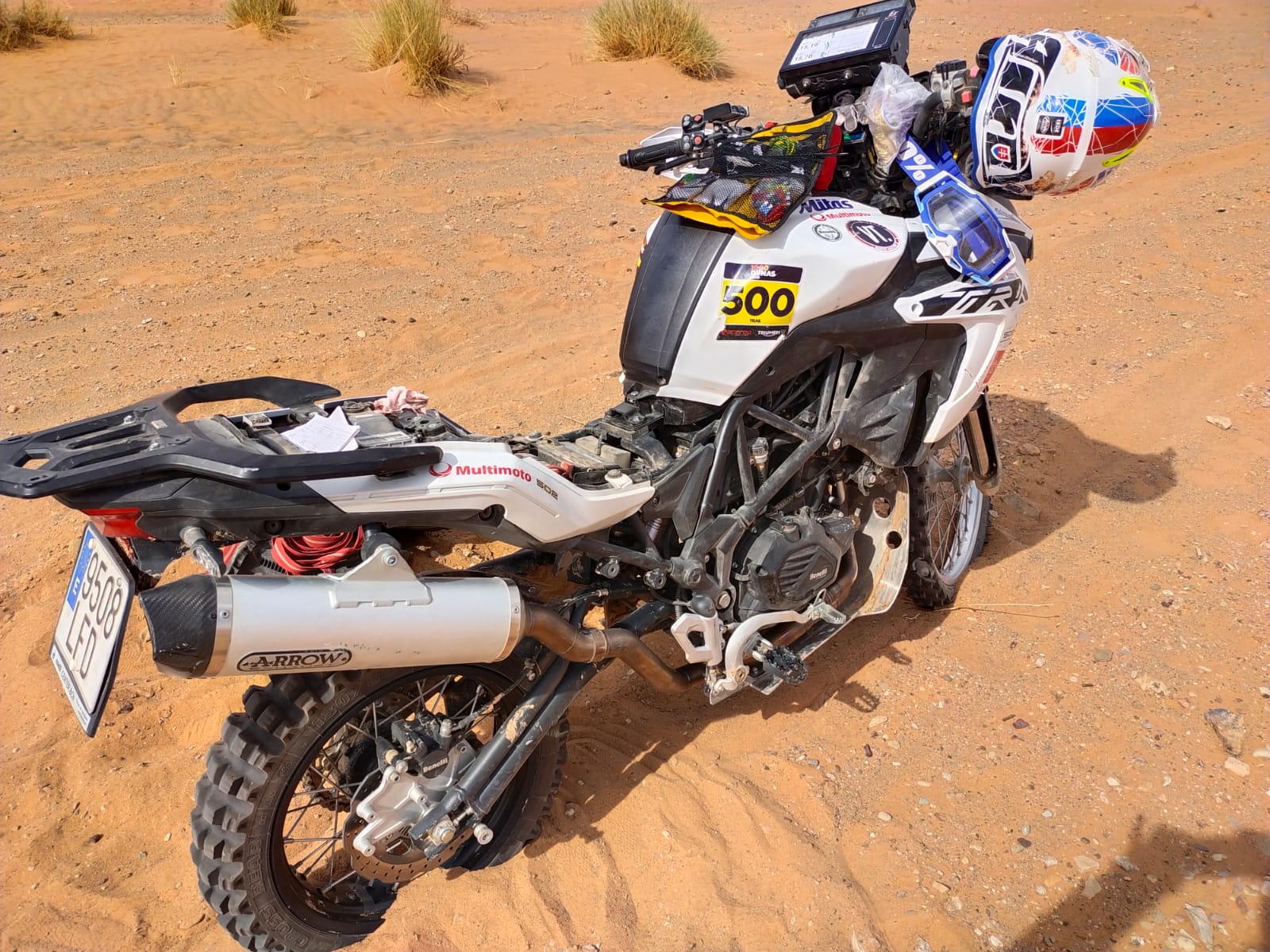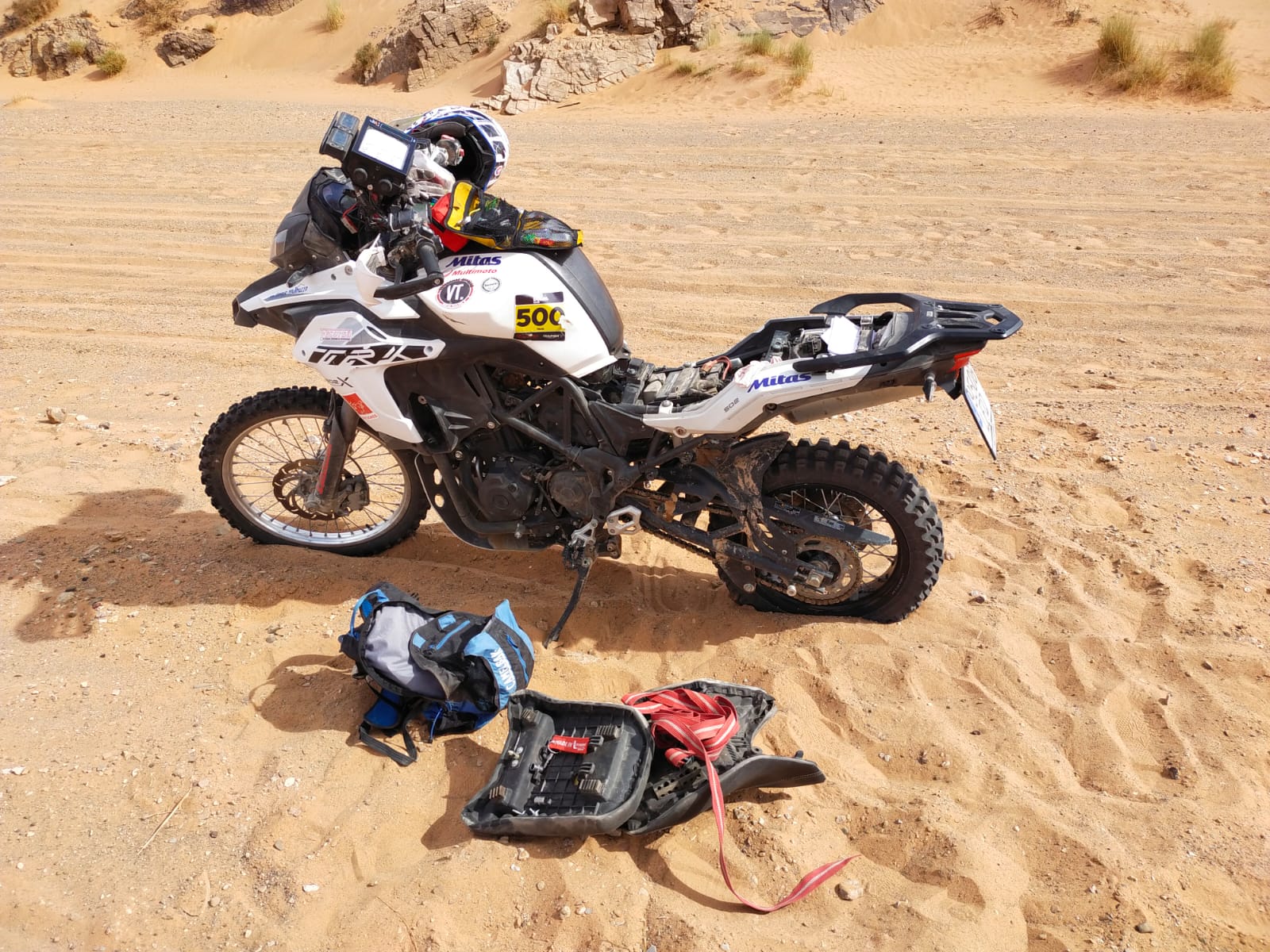 A nivel psicológico tienes que estar preparado ya que hay circunstancias en que si te pierdes, cosa que al final pasa a casi todos los pilotos alguna vez, puedes pasar horas en el desierto sin ver a nadie, ni una huella, pista o referencia en que guiarte para llegar a un punto donde haya civilización, miras hasta donde te llega la vista a tu alrededor en cualquier dirección, y ves el infinito del desierto, la verdad es que impone muchísimo si no estás acostumbrado, puedes ponerte muy nervioso y entrar en pánico, por suerte ya me había encontrado antes en circunstancias similares en multitud de viajes que había realizado a la aventura por Marruecos, Túnez incluso llegando a Libia y Argelia, por lo que sabía cómo salir de este apuro. La causa por la que nos perdimos muchísimos pilotos en este punto fue por una tormenta de arena, la cual nos sacudió bien, borrando las trazas del suelo que indicaba mi roadbook como referencia a seguir, decidí seguir el mismo rumbo que llevaba en la última indicación de navegación, hasta que divise unas colinas, estás estaban a unos 15 km, no dude en dirigirme hacia éstas para buscar alguna referencia, una vez en lo alto pude ver una pequeña edificación al este, la cual estaba a unos 5 km de donde me situaba, al oeste a unos 10 km se veía como un grupo de edificaciones o aldea, por lo que me puse como referencia un punto imaginario entre las dos edificaciones, con intención de encontrar alguna pista que comunicara ambos puntos y así fue, pudiendo retomar luego el recorrido. Me detuve a reparar y ayudar a pilotos que tenían averías en sus motos durante las etapas, haciendo mecánicas en pista.