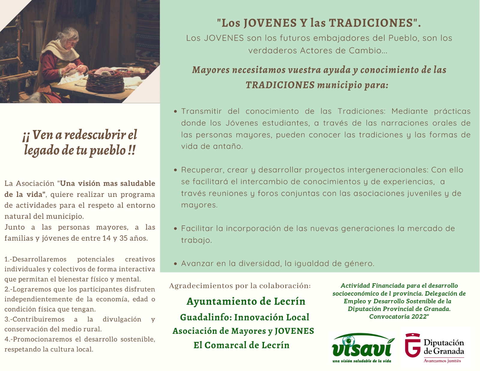 Lecrín ha sido la población elegida del Valle de Lecrín para este trabajo, aunque se trata de un proyecto en el que están presentes cuatro comarcas. Este tipo de actividades también se desarrollará en Bubión (comarca de La Alpujarra), Galera (comarca de Húescar) y Benamaurel (comarca de Baza). Una actvidad organizada por Visaví y la Diputación de Granada.
