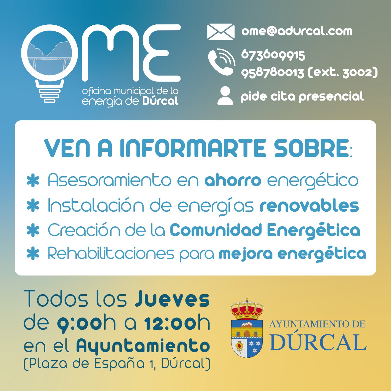 Desde hace unos días Dúrcal ya tiene su propia oficina municipal de la Energía. Un servicio municipal que ofrecerá asesoramiento en ahorro energético, información sobre la instalación de energías renovables y creará la comunidad Energética.