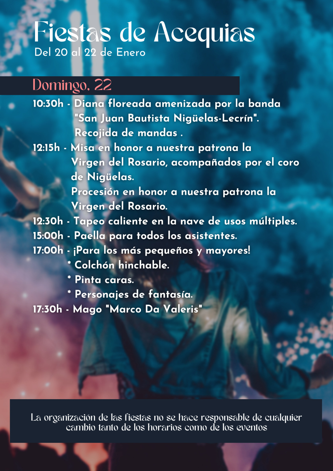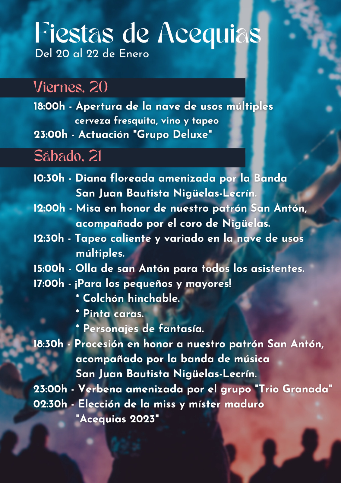 Acequias celebrará el próximo fin de semana sus fiestas patronales en honor a San Antón y la Virgen del Rosario. El viernes 20 de enero a partir de las 18h tendrá lugar la apertura de la nave de usos múltiples donde habrá cerveza fresquita, vino y tapeo y a las 23h contarán con la actuación «Grupo Deluxe»