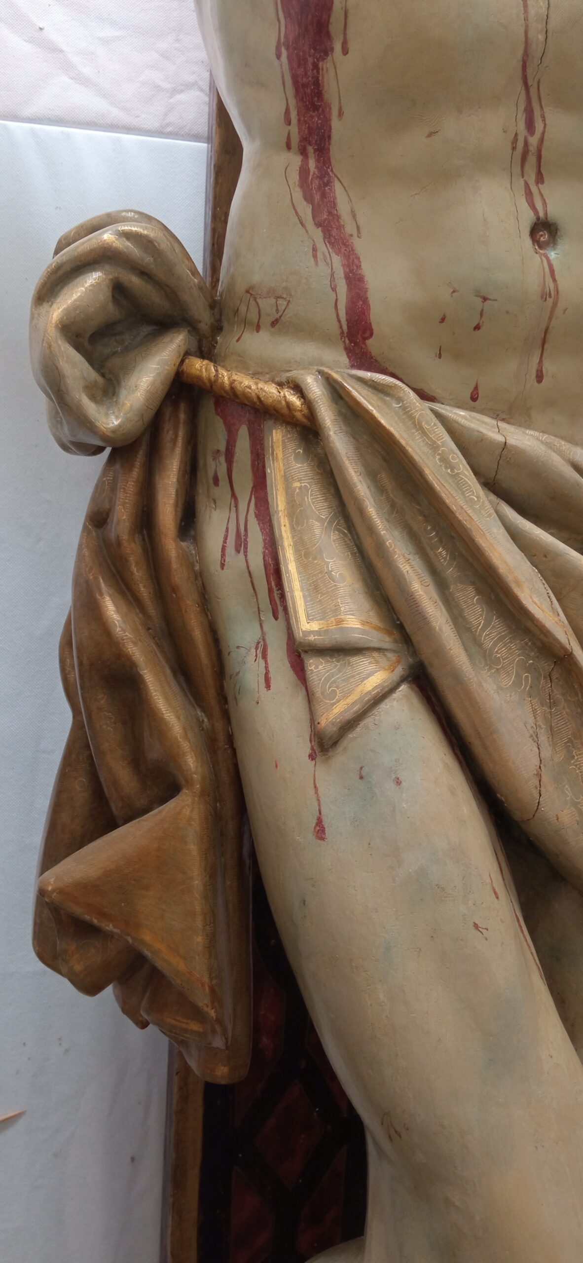 Ha sido un trabajo muy gratificante, tanto a nivel personal como profesional y es que una obra del siglo XVI y con esa calidad, es todo un privilegio para cualquier restaurador. Ya llevábamos estudiando la obra desde un poco antes de la pandemia, donde ya se empezaban a percibir algunos daños en la policromía. El proceso que se ha llevado a cabo en la obra, ha sido conseguir una estabilización de la policromía que en algunas partes se estaba empezando a desprender. Pero lo más sorprendente ha sido cuando se procedió a la limpieza de la obra, donde el paño de pureza del cristo presentaba un barniz muy oxidado y amarillento ocultándose unos esgrafiados maravillosos bajo ese viejo barniz. Un paño donde cabe destacar la profesionalidad que tuvieron tanto el escultor Pablo de Rojas al realizar la talla como al policromador Pedro de Raxis. En esa limpieza además de recuperar el esplendor del paño con sus dorados, se han podido ver como la policromía del Cristo a ganado en color, donde los golpes, sangre y moratones han vuelto a resaltar dando el realismo que tuvo la obra al principio.