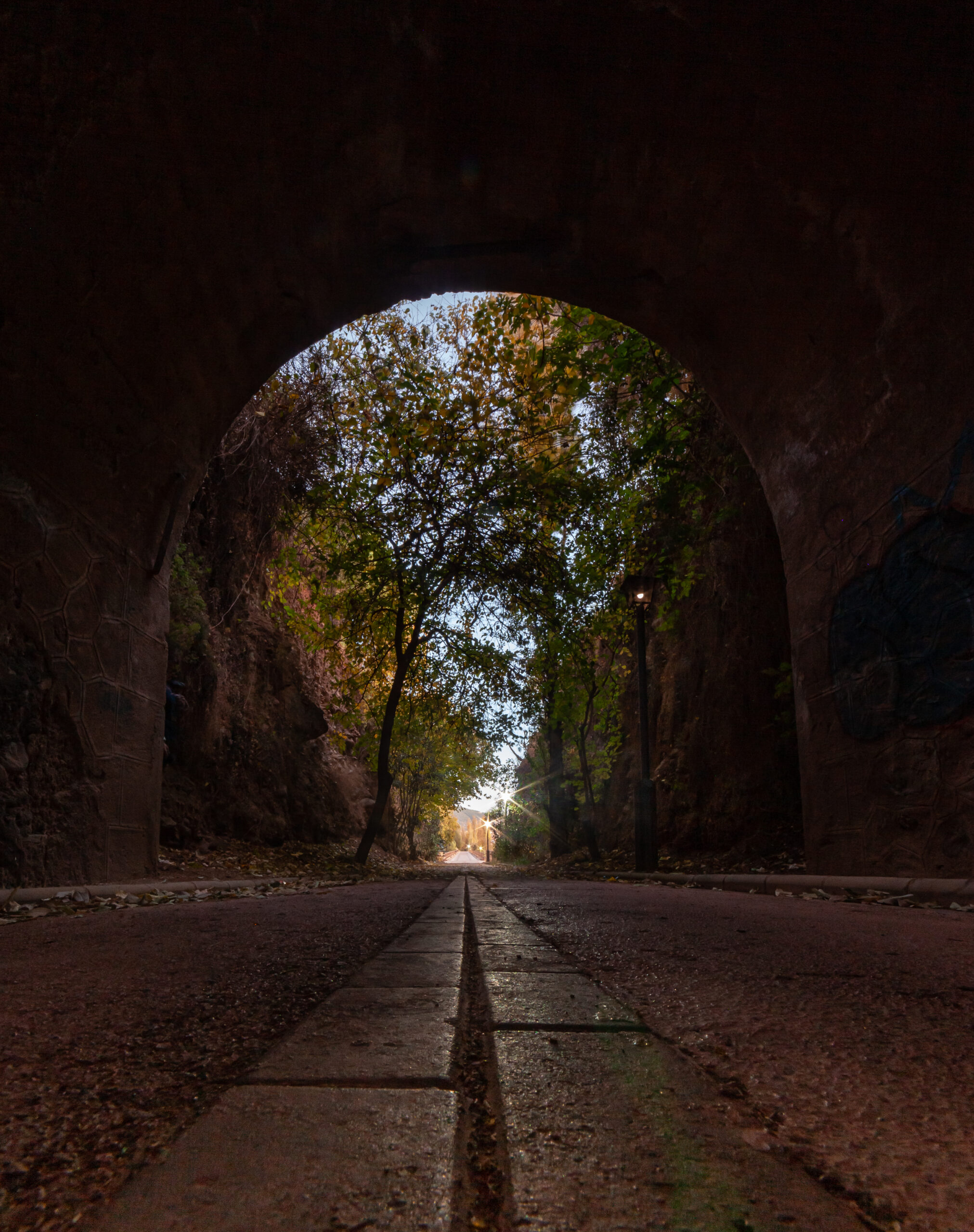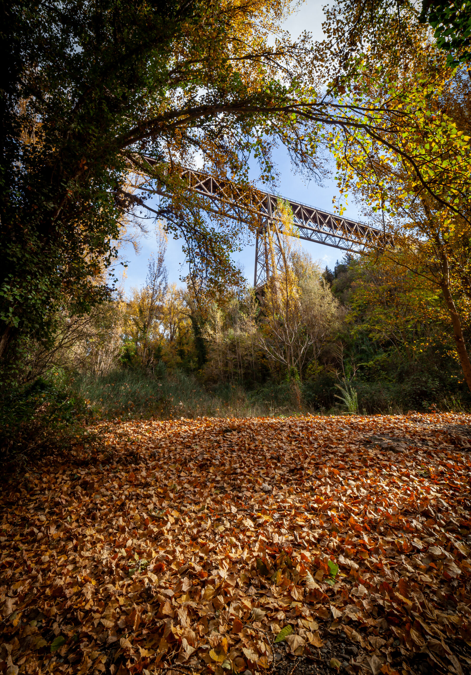 Desciendes al río por una vereda estrecha y rápidamente te encuentras con una gran vegetación y aparecen los colores del otoño, amarillos, verdes, rojizos y anaranjados. Los árboles buscan la luz, intentando alcanzar al puente que permanece erguido sobre nuestras cabezas.