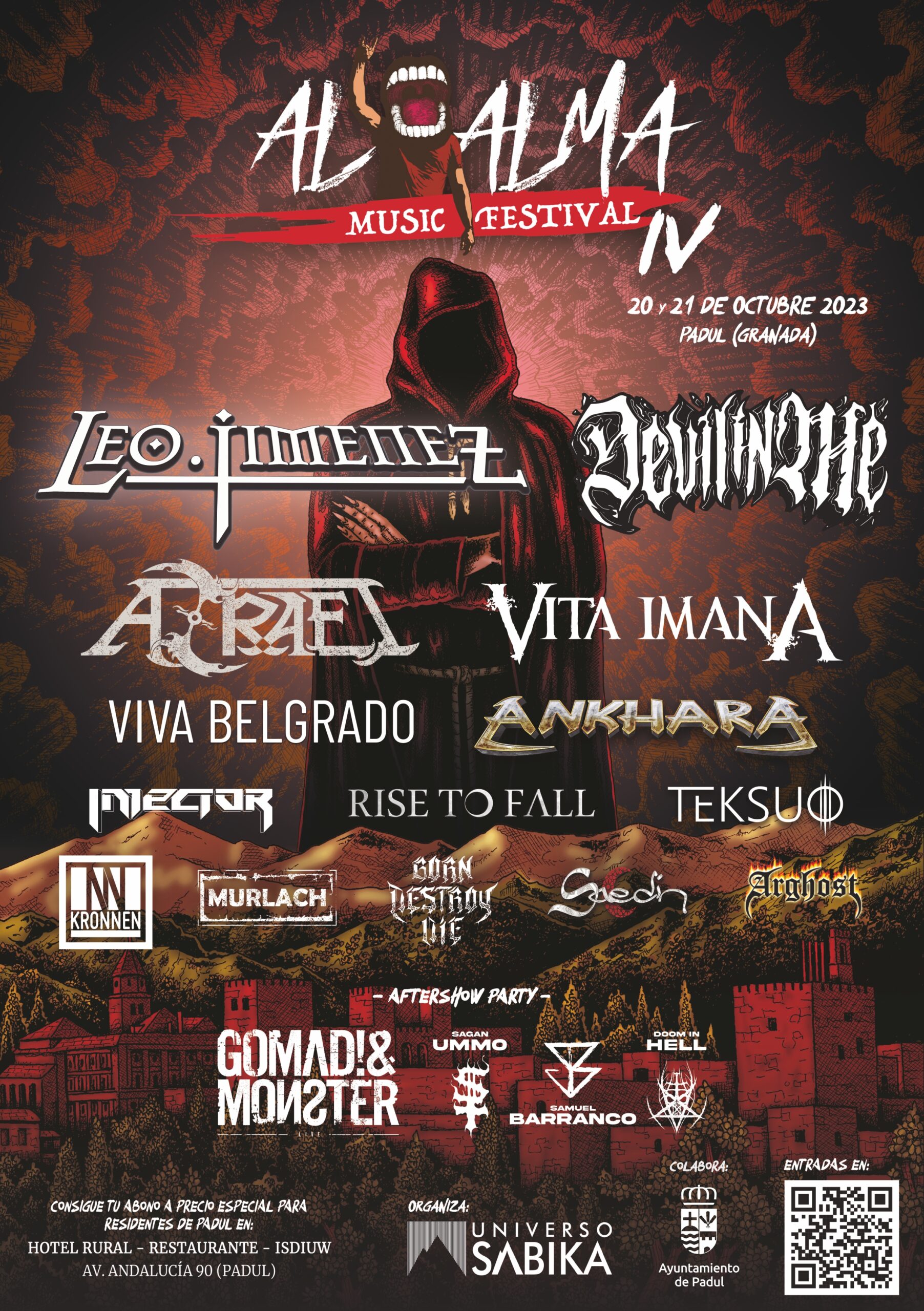 El viernes 20 de octubre, el festival arranca con una dosis de hardcore y metal que te hará mover la cabeza sin parar. Los artistas confirmados incluyen a Vita Imana (Groove Metal, Madrid), Viva Belgrado (Post Hardcore, Córdoba), Rise To Fall (Death Metal Melódico, Bilbao), Kronnen (Metal alternativo, Granada), Murlach (Punk Rock, Granada), Born Destroy Die (Hardcore, Granada) y Gomad! & Monster (Rave&Roll, Madrid). La noche del viernes promete una descarga de energía pura que dejará al público con ganas de más.