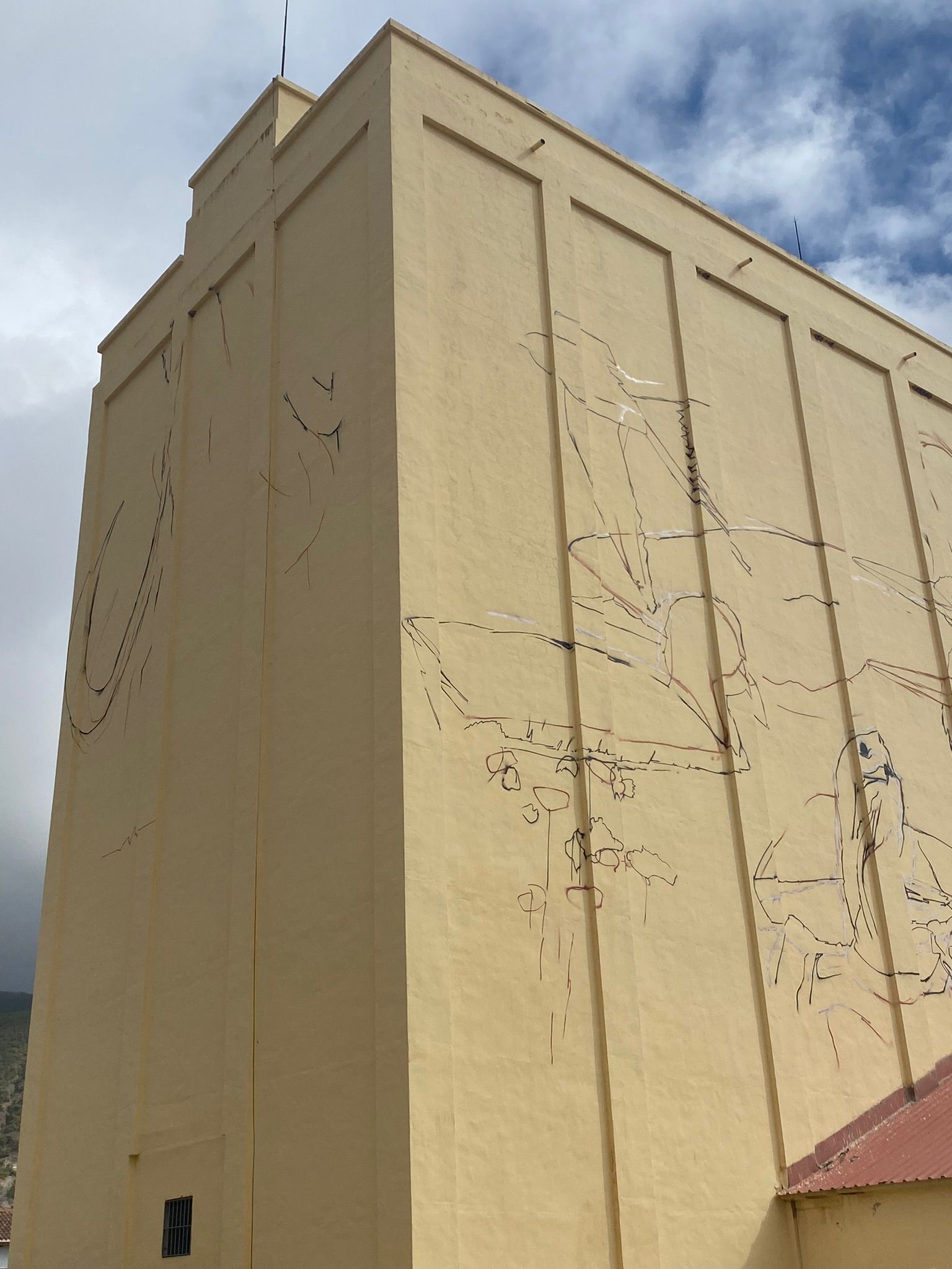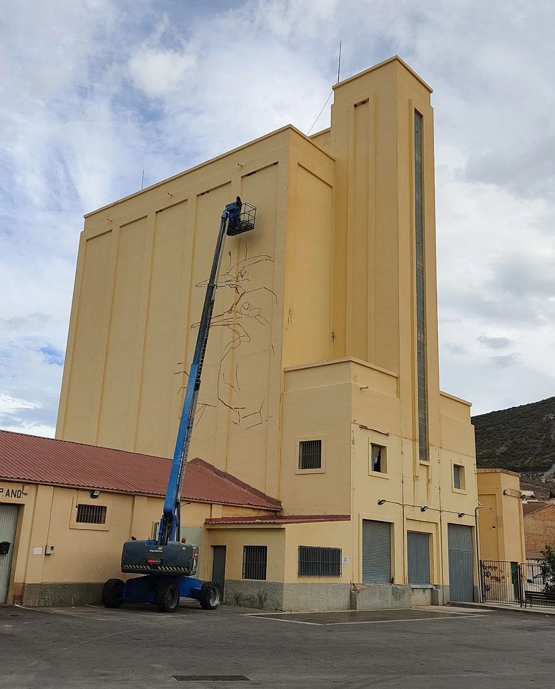 Esta mañana, a pesar de las inclemencias de la borrasca Alice y las fuertes rachas de viento que ha traído aparejadas, el grafitero ha comenzado a trazar los primeros esbozos de la que será el proyecto de mayor envergadura hasta la fecha. El mural va a ocupar casi 2000 metros cuadrados cubriendo toda la superficie del edificio, construido en forma de prisma en los años 40 del pasado siglo con una altura superior a los 30 metros. El artista urbano calcula que el proyecto estará finalizado aproximadamente en un par de meses.
