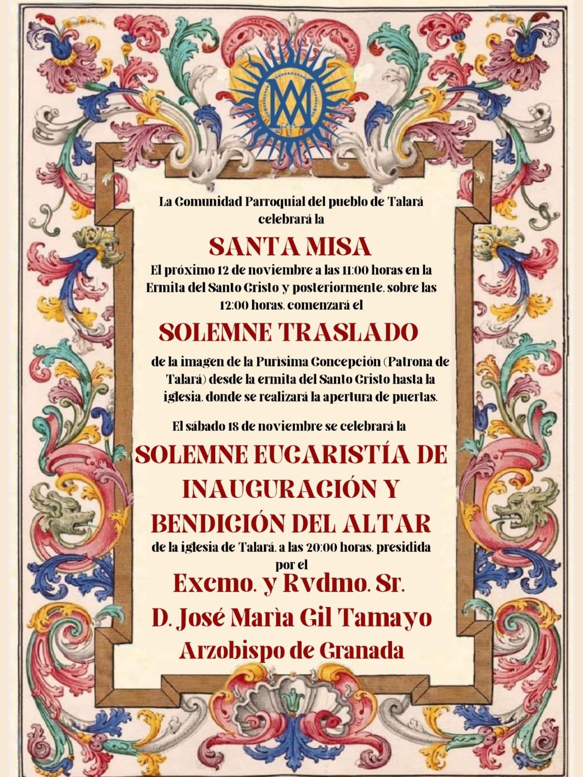 Los actos darán comienzo el domingo 12 de noviembre a las 11:00 horas en la Ermita del Santo Cristo, desde donde se procederá al solemne traslado de la imagen de la Purísima Concepción, Patrona de la localidad, hasta la iglesia, donde se realizará la apertura de puertas. Será el sábado a partir de las 20:00 horas cuando se celebrará la solemne eucaristía de inauguración y bendición del altar a cargo de José Maria Gil Tamayo, Arzobispo de Granada.