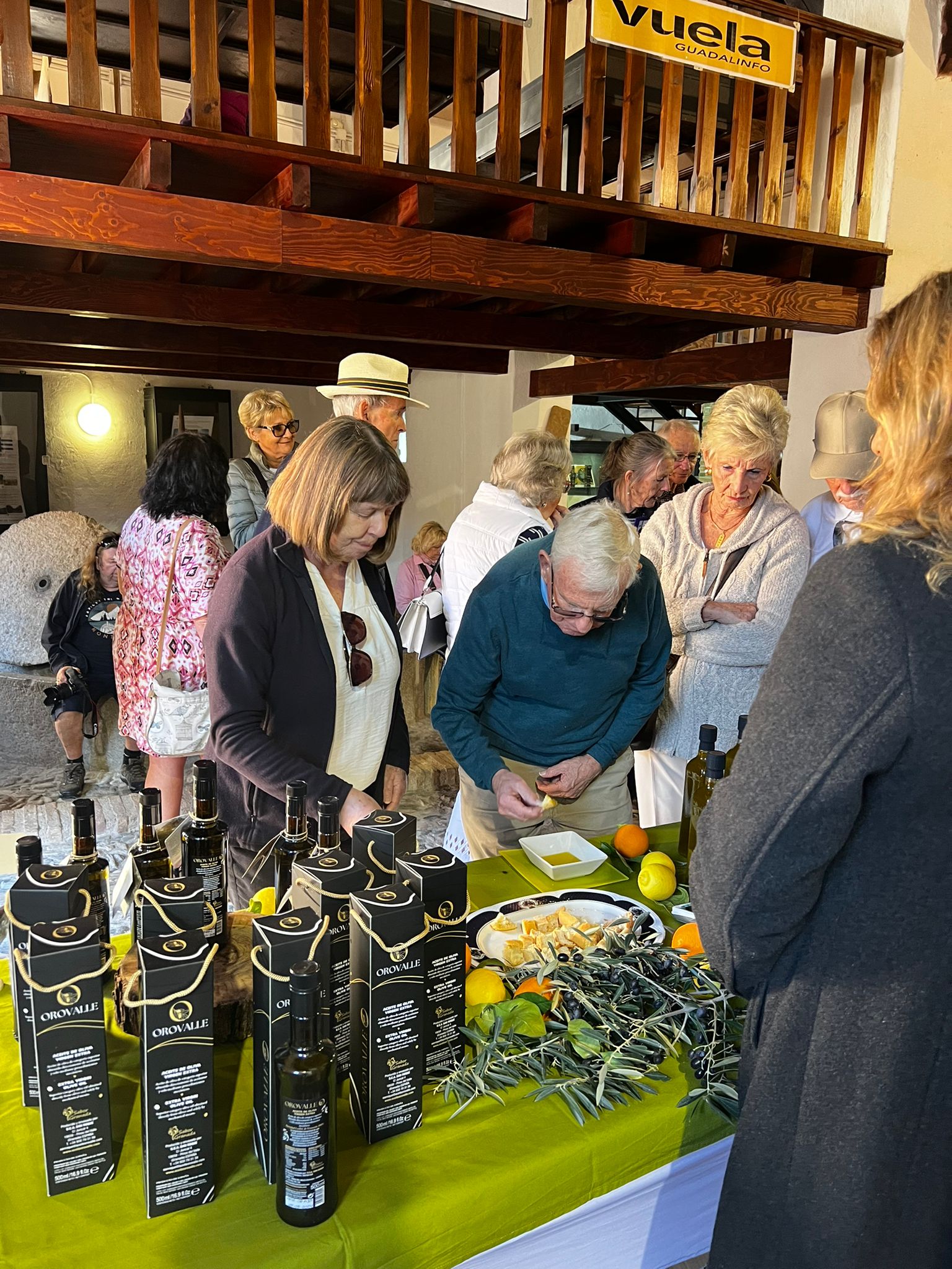 Allí les espera María Maldonado, de Cooperativa San Roque que les explica el proceso de extracción del aceite y sus peculiaridades en la comarca, tras lo que les da a degustar Orovalle, el aceite gourmet elaborado exclusivamente a base de aceituna lechín en la Cooperativa en Pinos del Valle. “Gold oil in Gold Valley” comenta una de las turistas para la que no han pasado desapercibidos los atributos de este oro líquido del que ha destacado su gusto “like a pepper”. Tras saborearlo debidamente, se lleva consigo un par de botellas de esta exquisitez del Valle de Lecrín, con sabor a pimienta, que “never before” ha degustado su paladar.