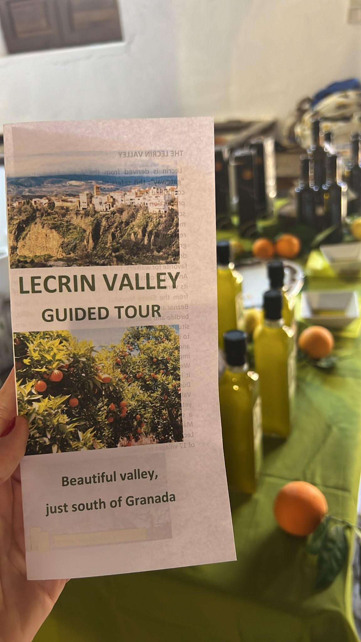 Llegan en autobús desde Salobreña dispuestos a dejarse llevar y deleitarse con los colores, olores y sabores del Valle de Lecrín. Son medio centenar de turistas británicos, guiados por Juan Bolívar, que comienzan descubriendo que Lecrín proviene del árabe Iqlim y que significa «puerta de entrada», aunque, según otra escuela de pensamiento, Valle de Lecrín en realidad significa «Valle de la Alegría». Lo que les empieza a quedar claro nada más llegar, es que la comarca es una hermosa zona verde cubierta de huertos al pie de Sierra Nevada con un rico e interesante pasado árabe. Una tierra fértil, donde olivos centenarios conviven con cítricos dando lugar a un aceite excepcional.