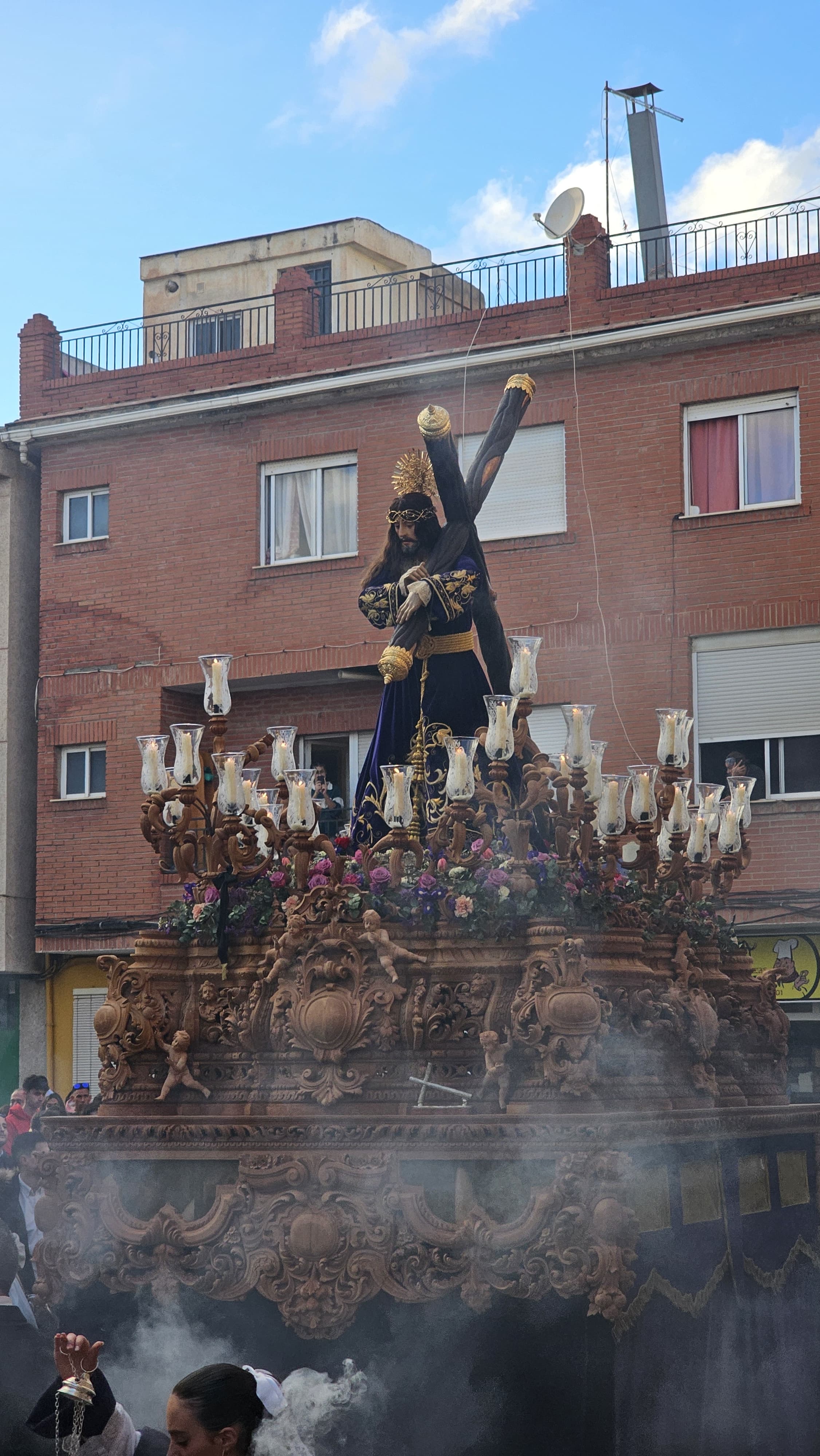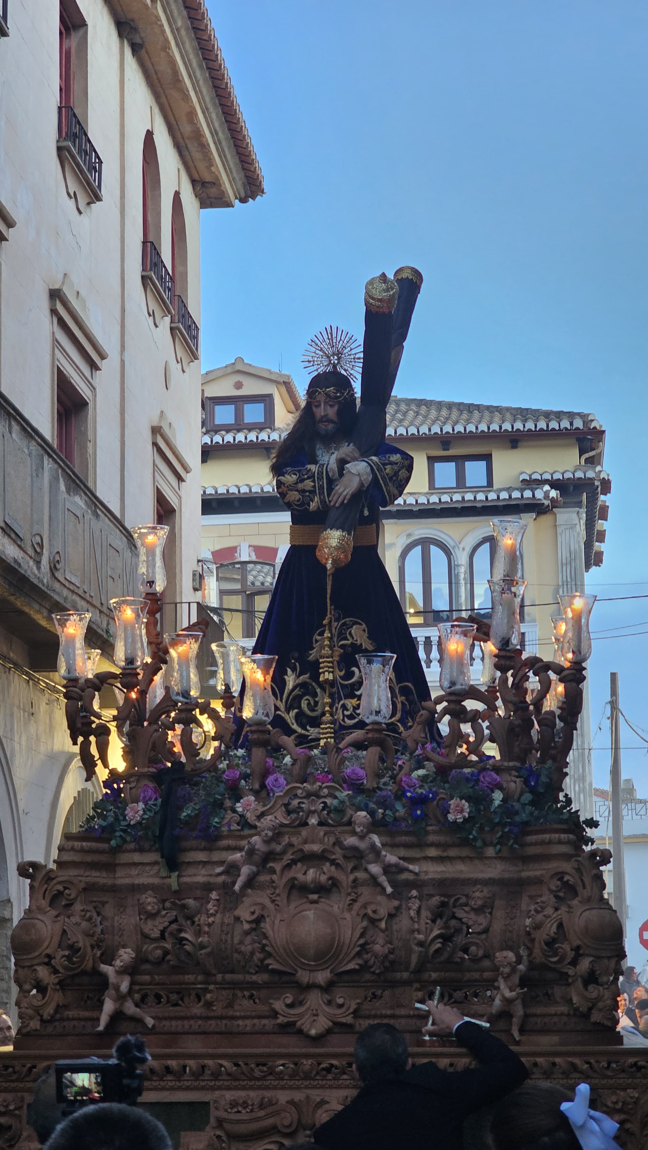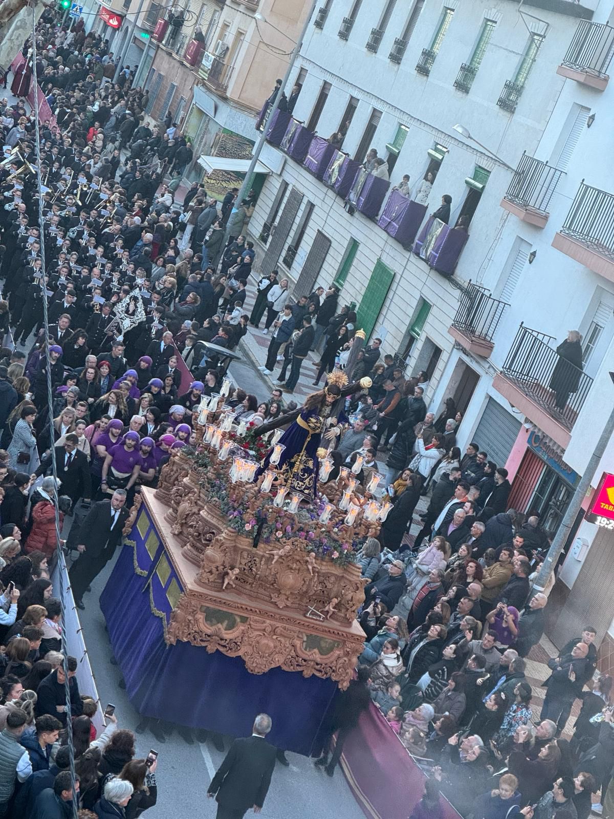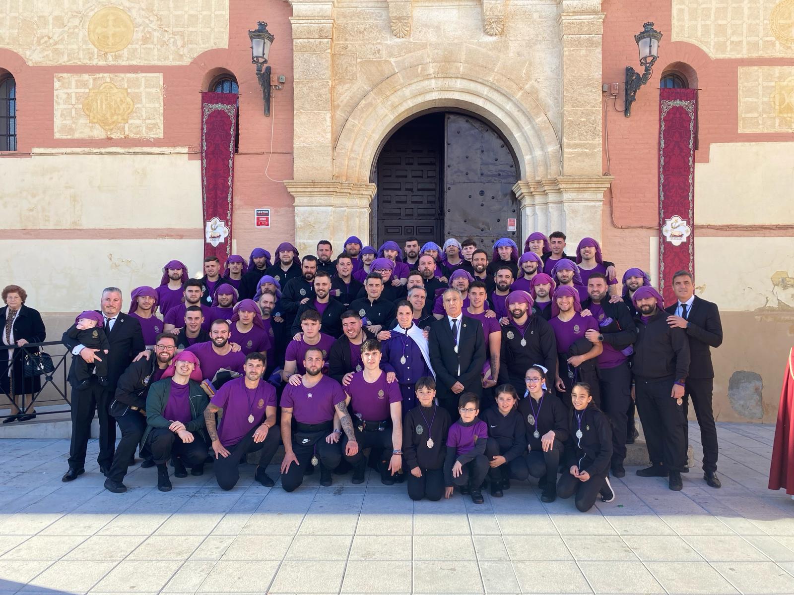 A nuestros penitentes, por acompañar, desde el anonimato, el caminar de su Señor. A los que llevan la cruz guía y faroles, la bacalá y nuestro libro de venias. A nuestros querubines, la legión más fiel e inocente que tiene el Señor. Más de cuarenta niños, monaguillos, cuidados con esmero por nuestras diez servidoras. A todas las mantillas que quisieron acompañar, desde el luto, el paso del Nazareno. A nuestro cuerpo litúrgico y acólitos cuya luz y nubes de incienso hicieron las delicias de los presentes, engrandeciendo el caminar de Cristo bajo el peso del madero. A la legión morada guiada por el cuerpo de capataces y contraguías. Por ser los pies del Señor en la tierra y por querer tanto y tan bien a su Señor. Sólo Dios podrá pagar vuestro esfuerzo cada Viernes Santo. A nuestros siete pipoteros, que sofocaron la sed de nuestros costaleros. A los auxiliares de paso que hicieron muy fácil el discurrir de nuestra Hermandad, solventando cualquier impedimento y estando pendientes de cada detalle o dificultad que pudiera suceder. A todos los cofrades que, año tras año, acompañan al Señor tras el paso haciendo, de este modo, su particular penitencia.