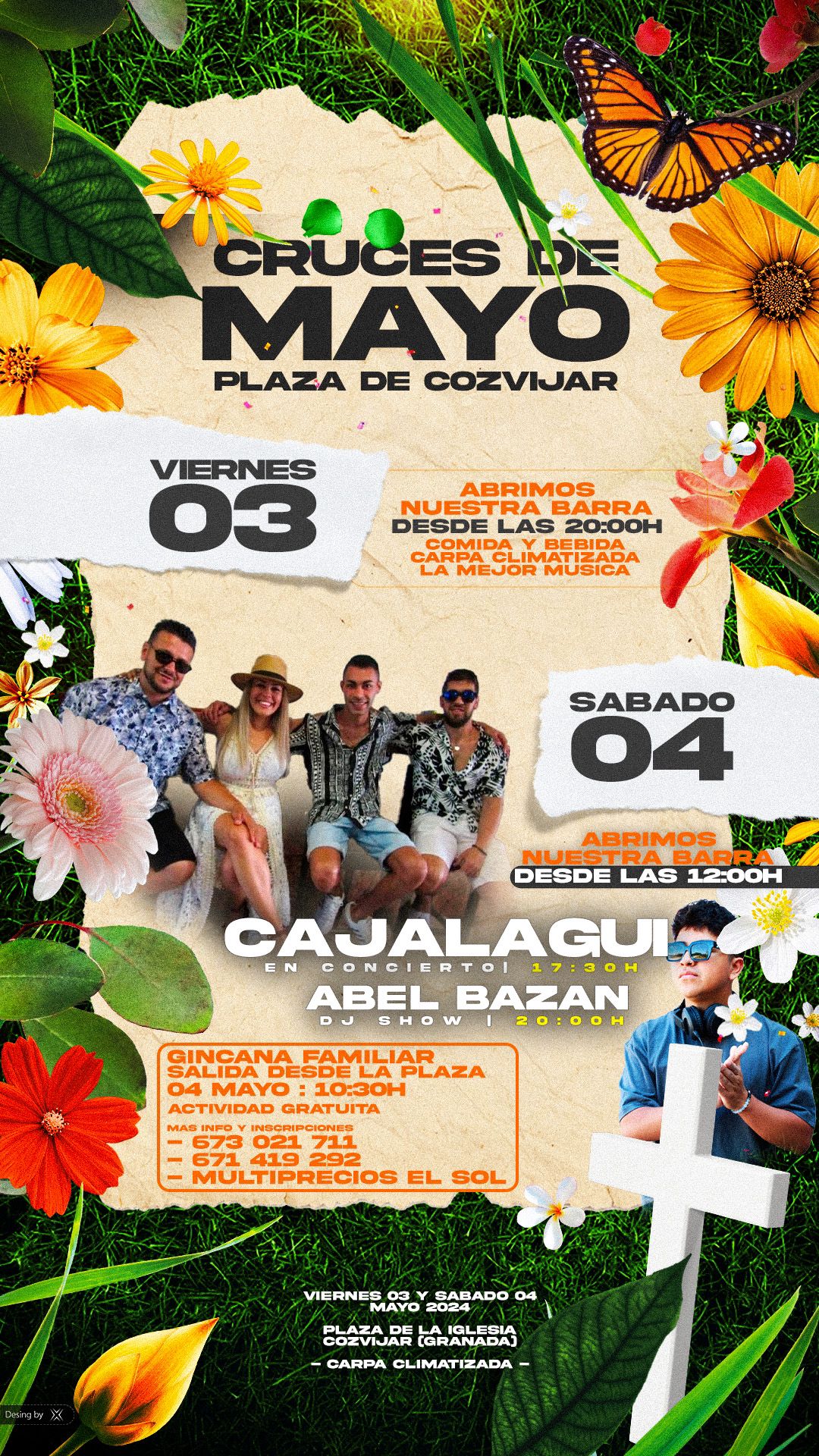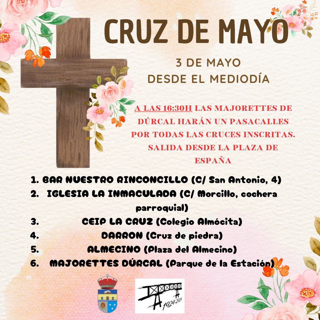 En Dúrcal el Día de la Cruz se va a celebrar el viernes 2 de mayo, con el montaje de cinco cruces: la tradicional cruz del Darrón, la cruz de la Asociación parroquial del Santo Sepulcro y Nuestra Señora de los Dolores que estará instalada, durante el viernes, en la cochera parroquial de la calle Morcillo. Por su parte la Agrupación de Majorettes “Virgen del Carmen” instalará su cruz en el Parque de la Estación. En el patio del colegio de Almósita serán los alumnos y alumnas del cole de la cruz los que monten su barra para recaudar fondos para el viaje de estudios de sexto curso. También habrá cruces en el Almecino y en el Bar el Rinconcillo . Todas ellas contarán con barra. La Agrupación de Majorettes “Virgen del Carmen” visitará todas las cruces el viernes por la tarde.