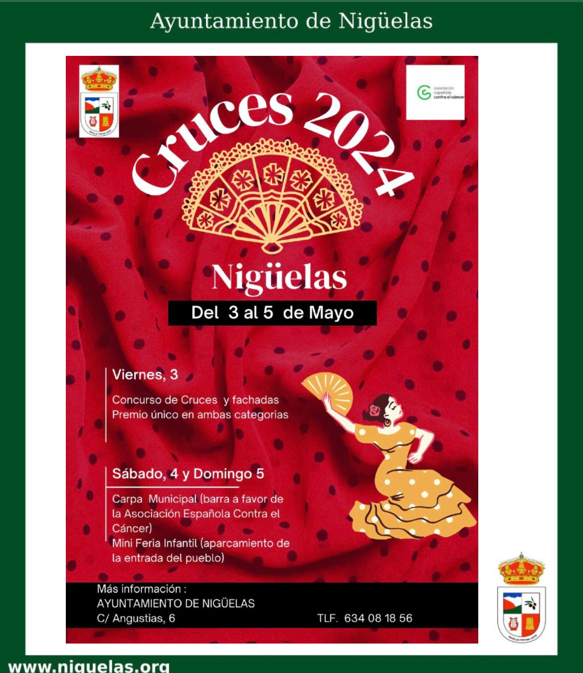En Nigüelas las cruces se celebrarán el sábado y el domingo en la cruz que se montará en la carpa municipal cuyos los beneficios de la barra irán a favor de la Asociación contra el Cáncer. Además, habrá una mini feria infantil en el aparcamiento de la entrada del pueblo.