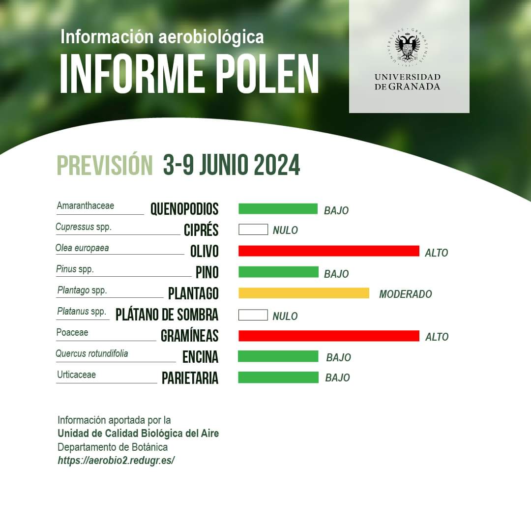 En la infografía hecha pública hoy por la Universidad, podemos ver además como en los niveles más bajos se encuentran ya parietarias, quenopodios y encinas. Un respiro para centenares de alérgicos del Valle de Lecrín que han vivido una primavera intensa.