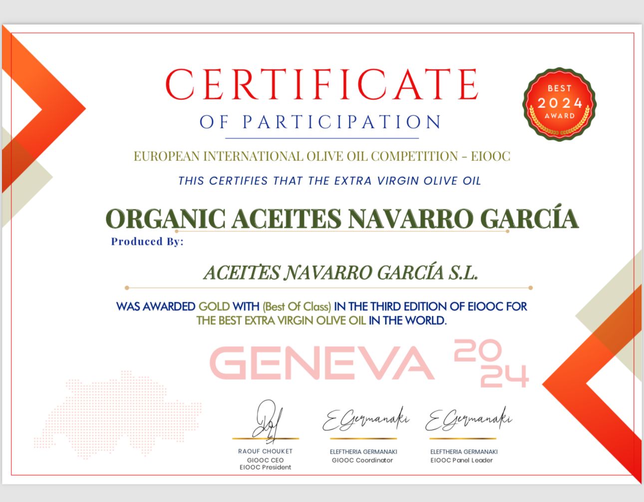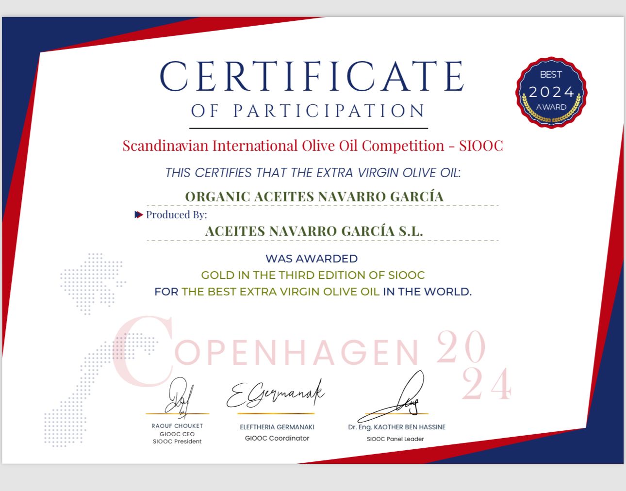 Su aceite ecológico ha sido reconocido por su calidad y excelencia en tres importantes ciudades europeas como son Copenhague, Ginebra y Berlín. Se trata de tres premios que desde Navarro García reciben como un reconocimiento al arduo trabajo y dedicación que ponen en cada gota de su producto.