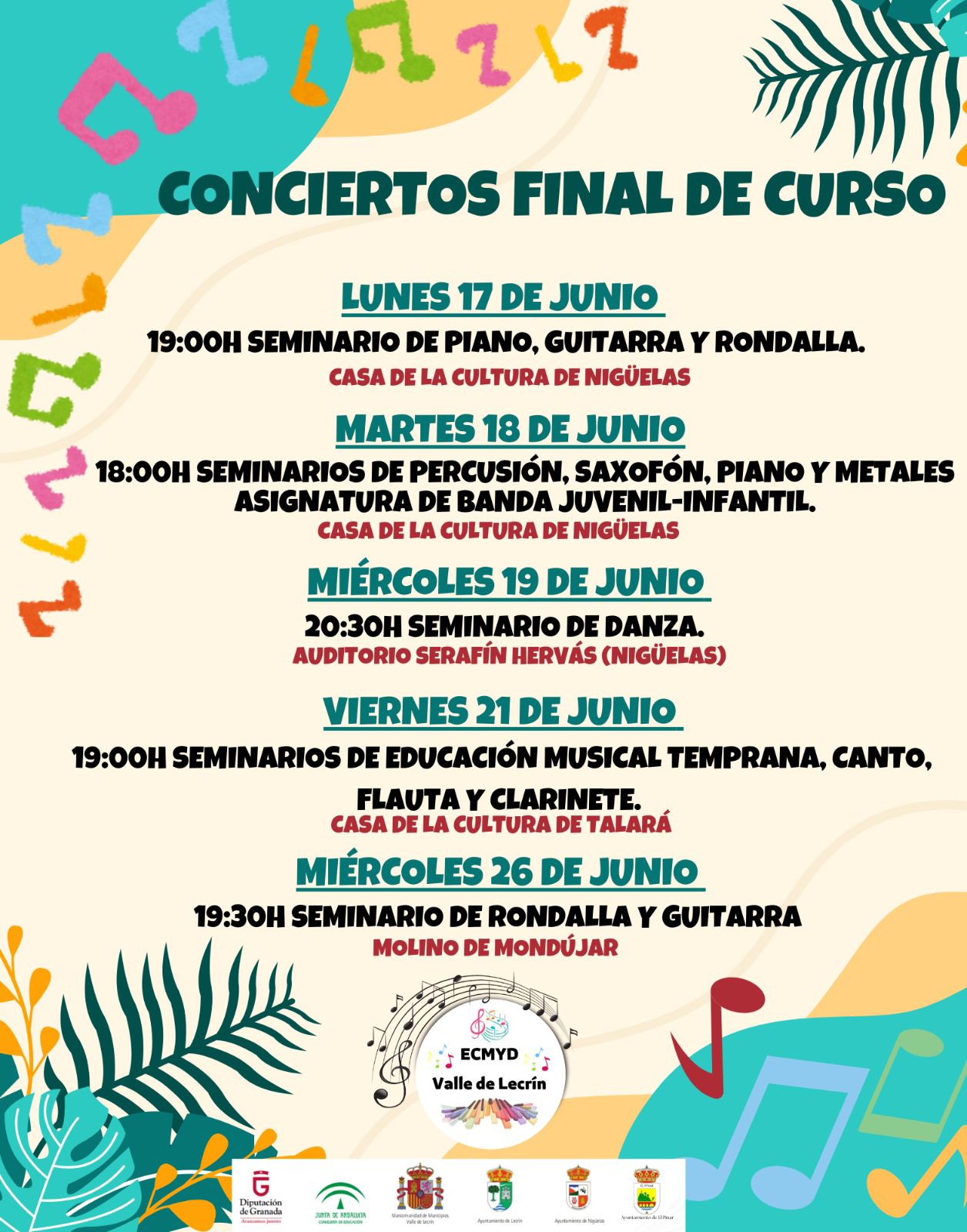 EL lunes 17 de junio la Casa de la Cultura de Nigüelas acogerá a partir de las 19h seminario de piano, guitarra y rondalla. El martes 18 de junio tendrán lugar seminarios de percusión, saxofón, piano y metales asignatura de banda juvenil-infantil, a partir de las 18h también en la Casa de la Cultura de Nigüelas.