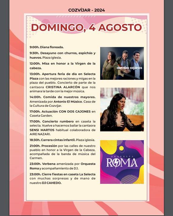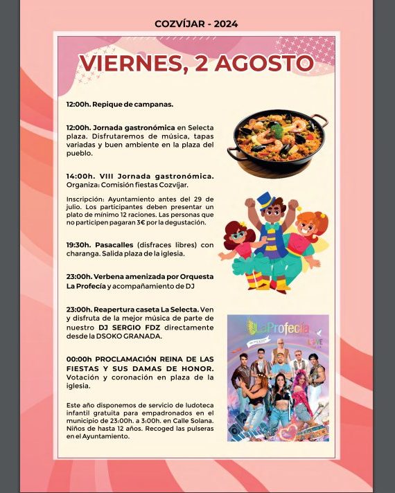 Como cada año cuando comienza agosto, Cozvíjar se echa a la calle para celebrar sus fiestas patronales por todo lo alto. Desde mañana viernes a las doce del medio día y hasta el próximo lunes a las seis de la mañana los cozvijeños y cozvijeñas, junto a todos los visitantes que se unen a ellos procedentes del resto de municipios del Valle de Lecrín, disfrutarán de un completo programa de actividades con el que vivir un fin de semana de fiesta sin pausa con la diversión como auténtica protagonista. Este año como novedad han puesto en marcha servicio de ludoteca infantil gratuito para empadronados en el municipio con horario de 23:00h. a 3:00h.