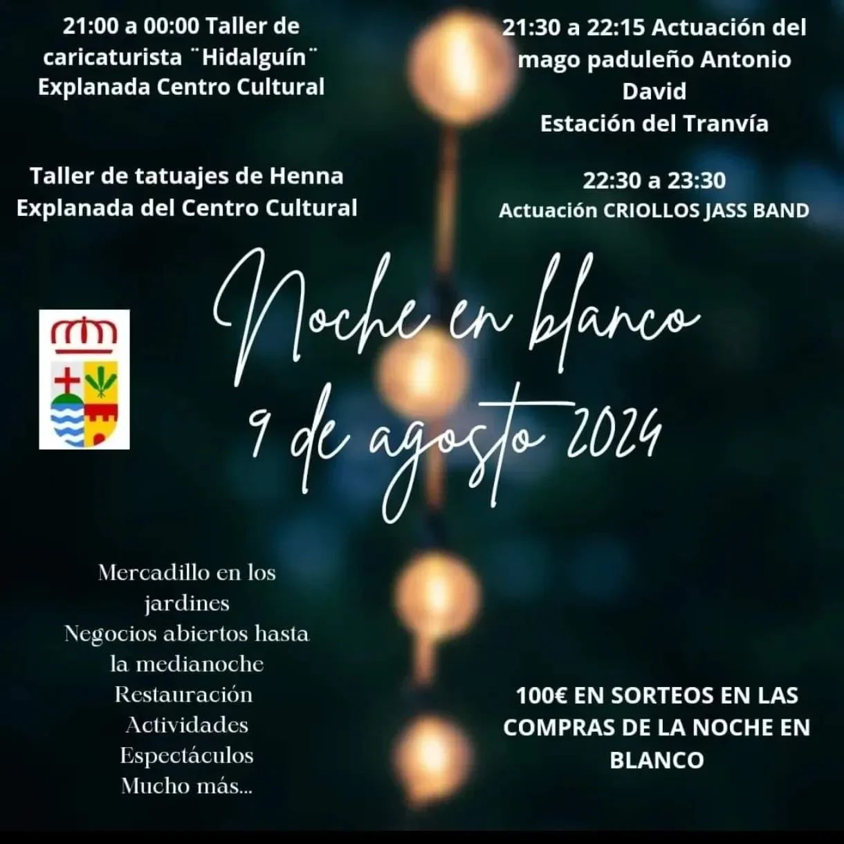 Esta tarde noche en Padul viene cargada de actividades para celebrar su Noche en Blanco. A partir de las 21h la explanada del Centro Cultural va a acoger talleres de caricaturas y de tatuajes. A partir de las 21:30h tendrá lugar la actuación del mago Antonio David, y a las 22:30h el concierto de la Criollos Jass Band.