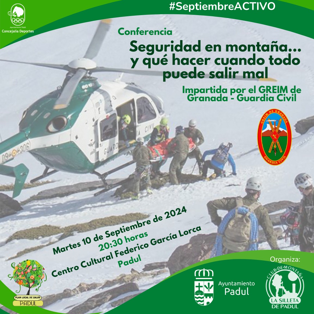 Si te apasiona la montaña, esta tarde tienes una oportunidad única para aprender de expertos cómo prevenir riesgos y reaccionar cuando las cosas no salen como esperabas. A partir de las 20:30 horas el Centro Cultural Federico García Lorca de Padul acogerá una charla impartida por miembros pertenecientes al Grupos de Rescate Especial de Intervención en Montaña de la Guardia Civil de Granada. Los agentes compartirán su valiosa experiencia en rescates y situaciones de peligro para ayudar a disfrutar de la montaña de forma segura. Se trata de una actividad está promovida por el Club de Montaña “La Silleta” de Padul».