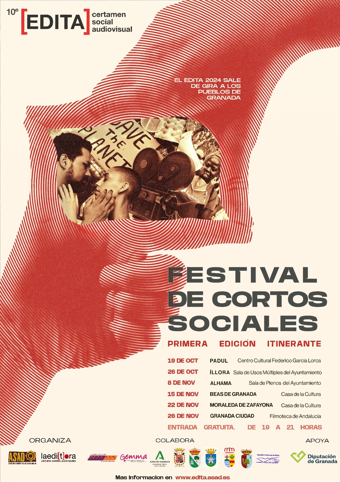 ASAD y la editora Social Audiovisual vuelven a organizar el Festival de Cortometrajes Sociales EDITA, un evento que apuesta por la visibilización de cortometrajes que denuncian las injusticias sociales y desigualdades, a pesar del transcurso del tiempo. En su décima edición, el festival se reinventa con una propuesta innovadora y transformadora: por primera vez, se convierte en un evento itinerante, extendiéndose por municipios de los diferentes pueblos de Granada.
