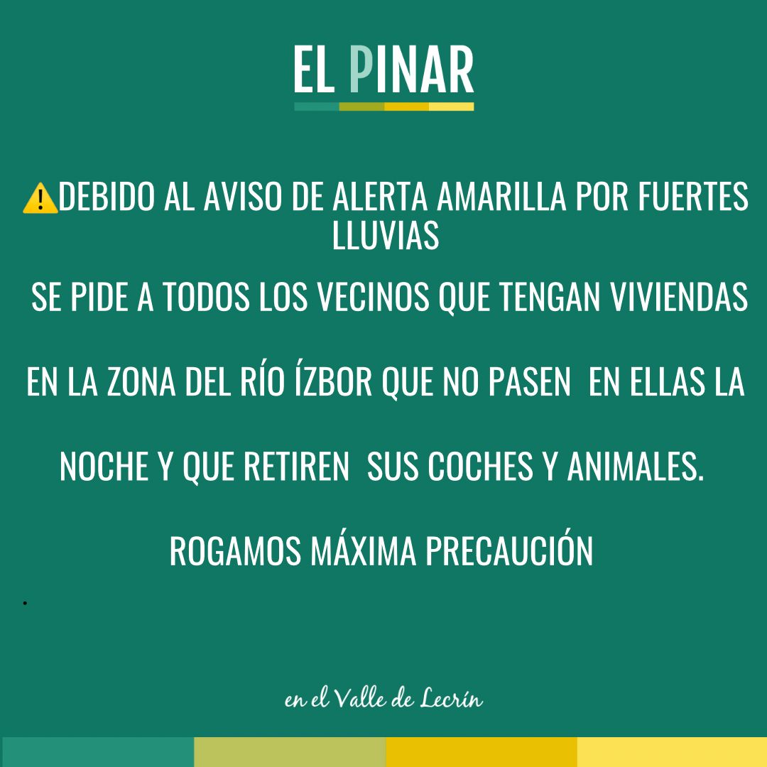 El consistorio además ha hecho un llamamiento en sus redes sociales, lista de difusión de wasap y a través de llamadas telefónicas a los vecinos y vecinas que tienen su segunda vivienda en la zona del río Ízbor, recomendándoles que no pasen en ellas la noche y que retiren sus coches y animales de la zona. Se les ha pedido máxima precaución ya que las últimas lluvias caídas causaron numerosos destrozos “el agua hizo mucho daño en Ízbor donde la crecida del río, alimentada por el barranco de Zazar que llega desde la Giralda y va recogiendo en su recorrido hasta once barrancos más, se llevó por delante fincas, vehículos y gomas de agua para el suministro de agua potable a las poblaciones de Ízbor y Acebuches. El agua desbordó por encima del muro del polideportivo de Ízbor y circuló dejando ramas, piedras y fango por donde iba pasando. Dejó al descubierto la goma de agua del pozo en varios puntos anegándolo”, explica la alcaldesa de El Pinar, Mercedes Moreno.