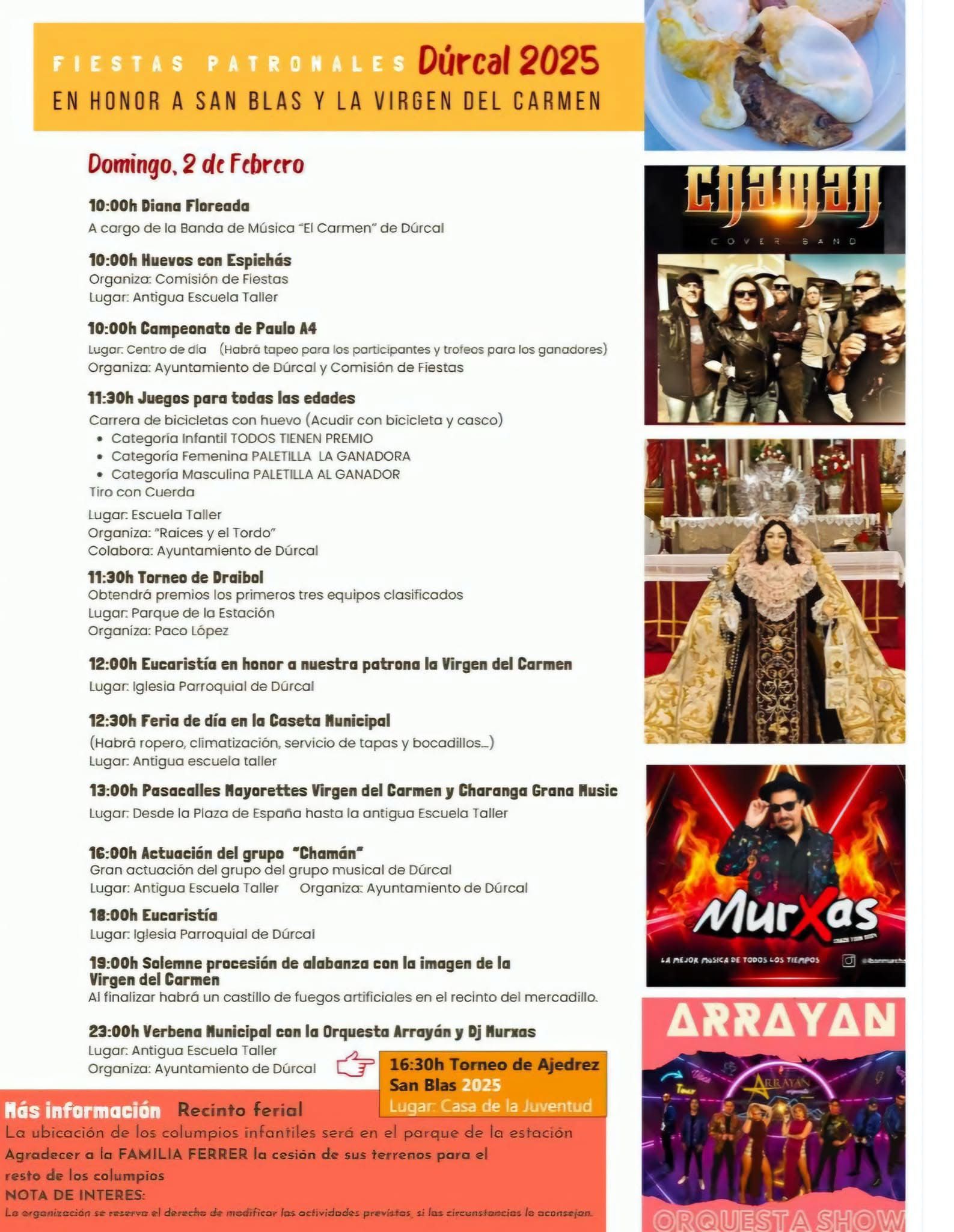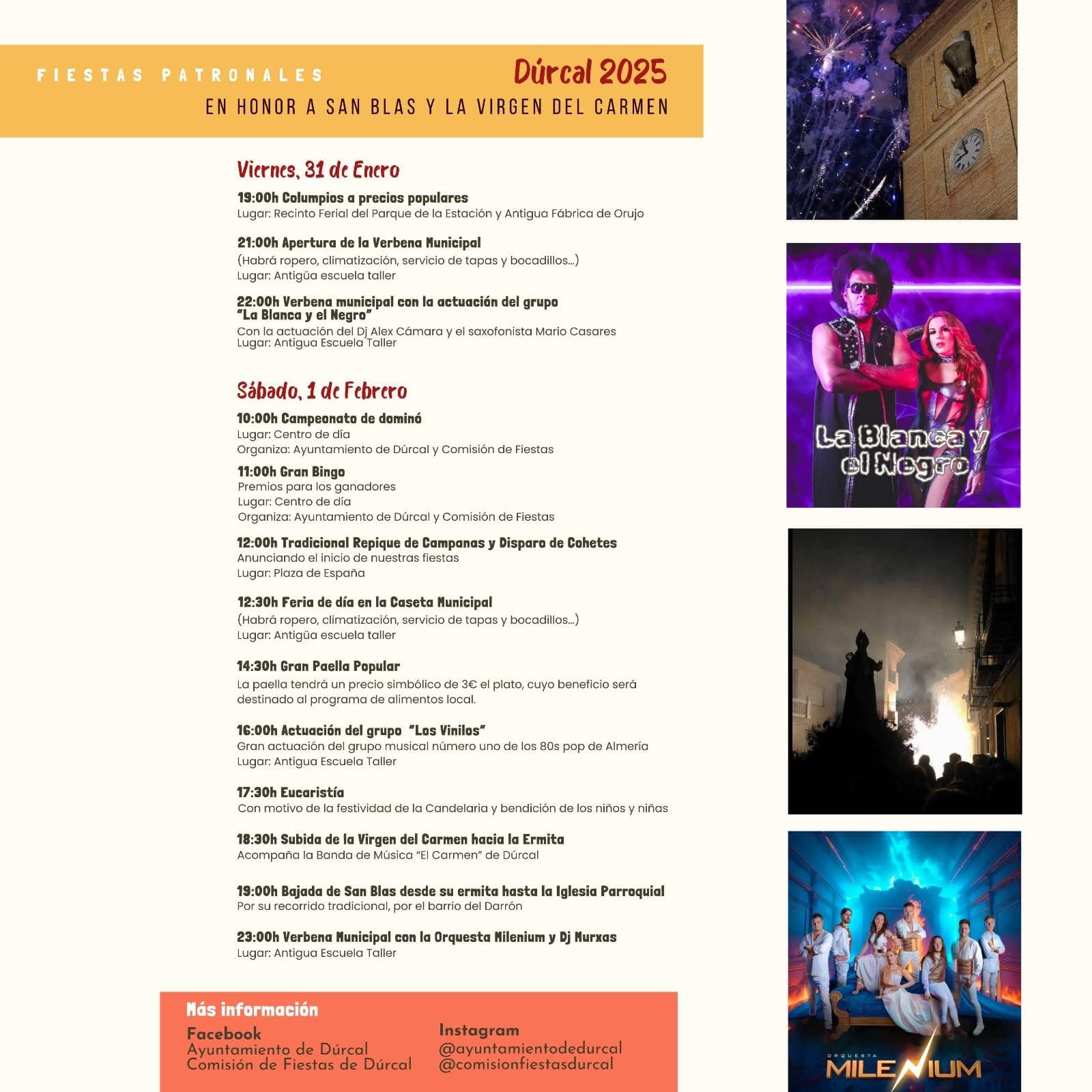 Los durqueños y durqueñas cuentan ya los días para que den comienzo las fiestas patronales en honor a San Blas y la Virgen del Carmen. Las actividades festivas arrancarán con la apertura de los columpios a precios populares, instalados en el recinto ferial del Parque de la Estación y la antigua Fábrica de Orujo. La verbena estará ubicada, un año más en la Antigua Escuela Taller.
