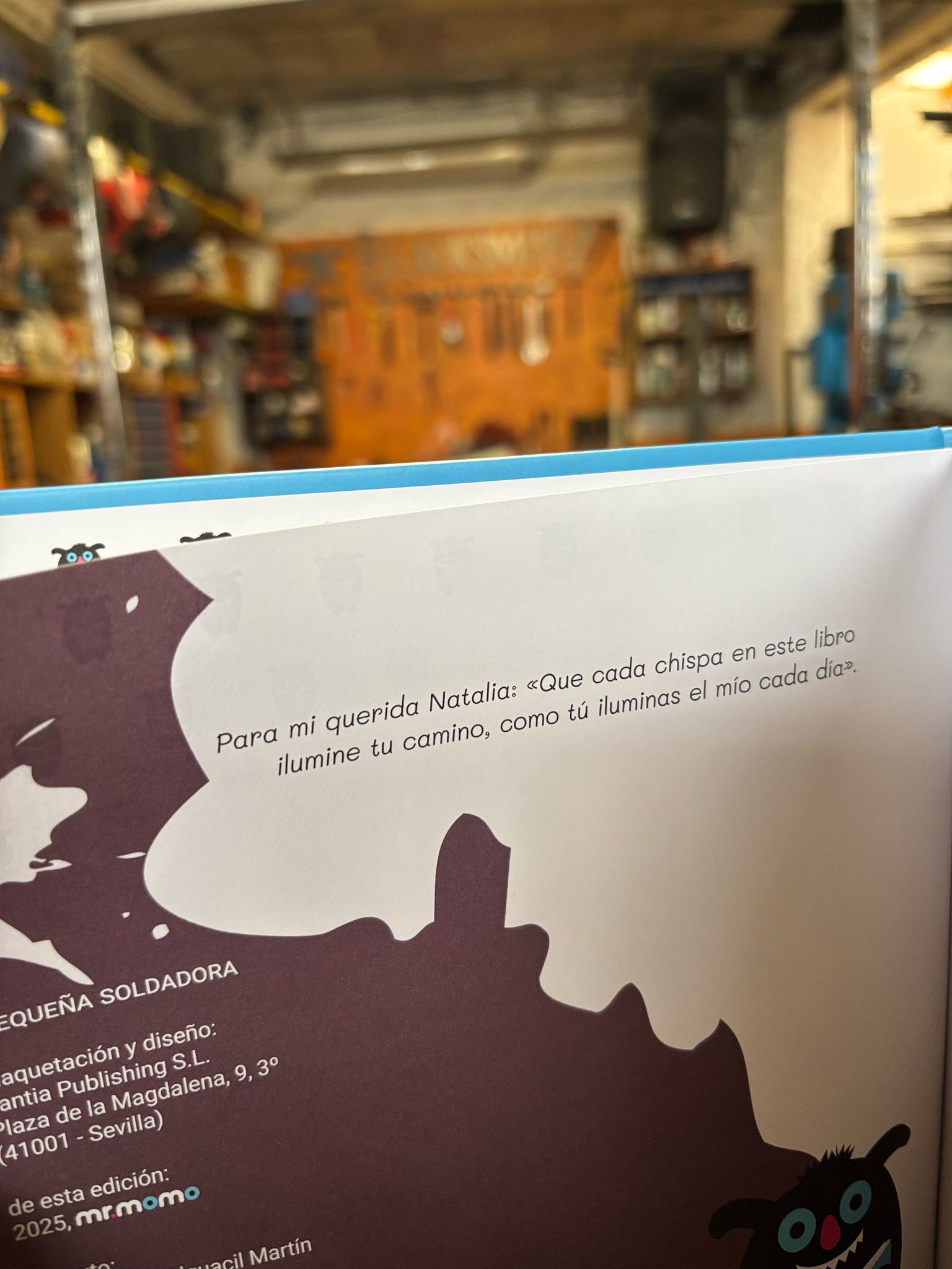 “La pequeña soldadora” está dedicado a su hija de siete meses a la que le ha regalado un deseo en la primera página del libro “Para mi querida Natalia: «Que cada chispa en este libro ilumine tu camino, como tú iluminas el mío cada día”.