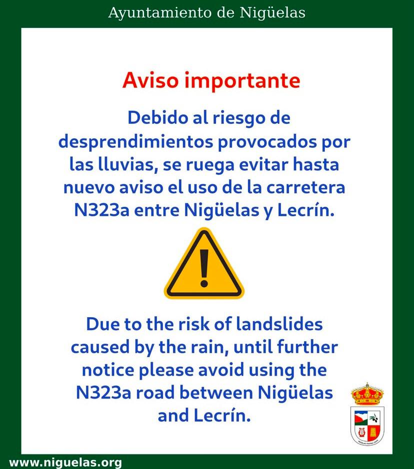 Debido al riesgo de desprendimientos provocados por las lluvias el ayuntamiento de Nigüelas ruega evitar hasta nuevo aviso el uso de la carretera N323a entre Nigüelas y Lecrín.