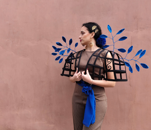 Es una apuesta por siluetas clásicas, como los vestidos entallados y los volantes, así como faldas tipo pareo y mangas voluminosas, elementos característicos del estilo tradicional. “He querido distinguirla por un toque personal a través de estampados únicos y piezas más vanguardistas, como un mono con chaqueta que evoca el delicado trabajo de la rejería. La paleta cromática combina azul, blanco, y marrón, evocando elementos de la naturaleza y emociones relacionadas con la noche, las flores y las raíces culturales. Cada tono aporta un simbolismo único: el azul intenso representa el misterio, el blanco la pureza, el marrón la conexión con la naturaleza”.