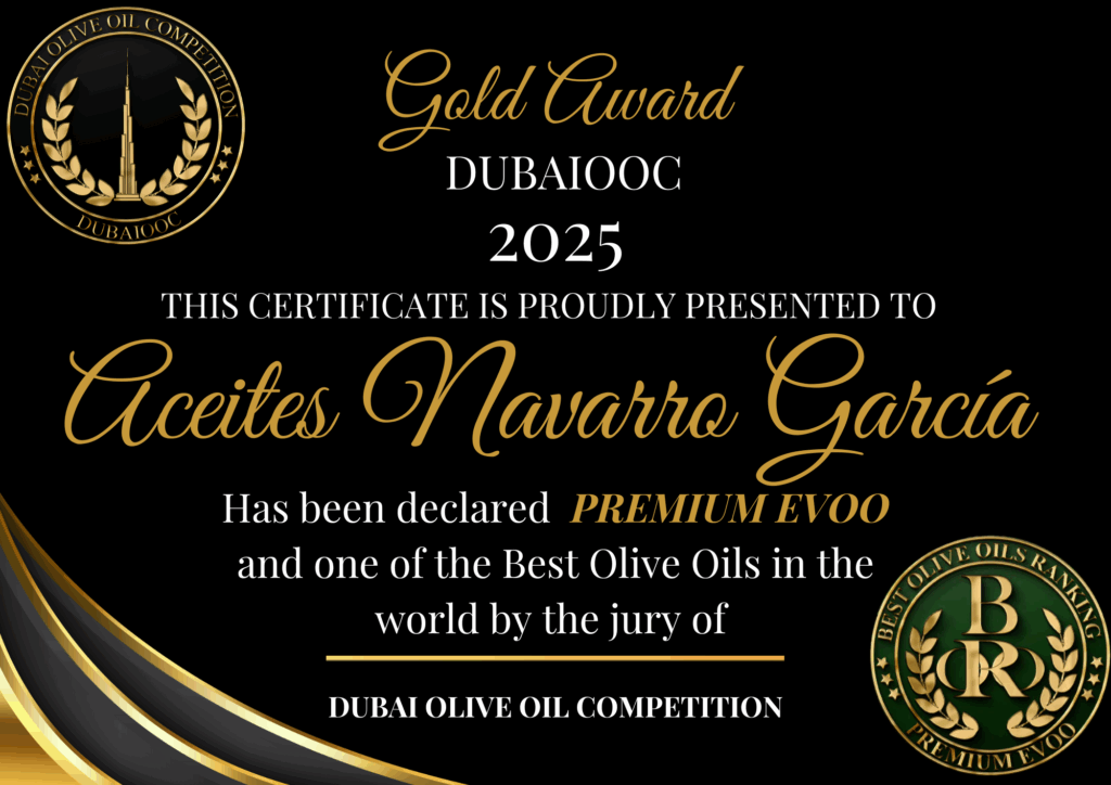 El aceite de oliva virgen extra de Navarro García continúa cosechando premios. Hace unos días ha sido galardonado con la medalla de oro en la Dubai Olive Oil Competition 2025, uno de los certámenes internacionales más prestigiosos del sector.