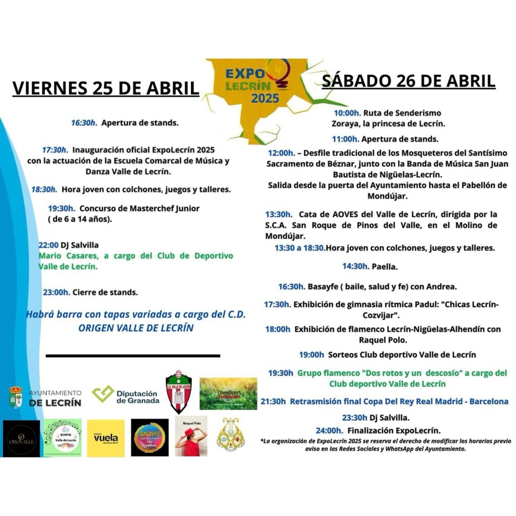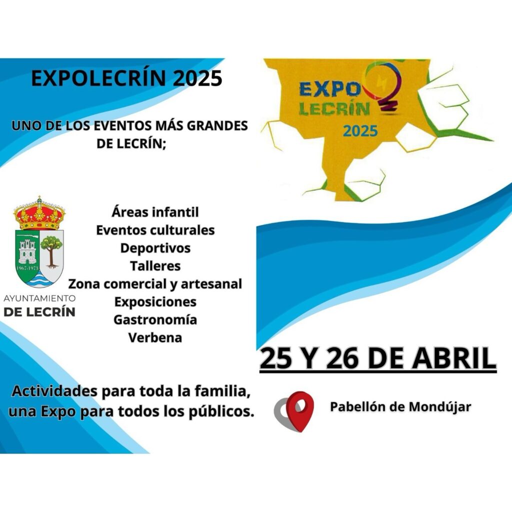 El Pabellón de Mondújar va a acoger una nueva edición de ExpoLecrín el próximo fin de semana. El viernes 25 y el sábado 26 de abril el evento ofrecerá actividades para toda la familia con una zona habilitada para los más pequeños. Se van a desarrollar actividades deportivas, culturales, talleres, exposiciones, zona comercial y artesanal, gastronomía y verbena.
