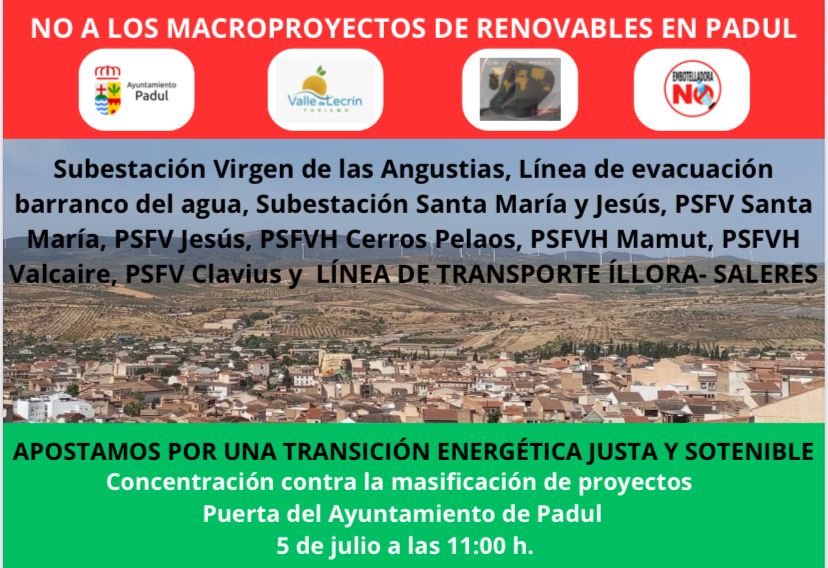 La alcaldesa de Padul Celia Villena ha realizado un llamamiento, en representación del Ayuntamiento, a todos los vecinos y vecinas de la localidad para que participen en la concentración que tendrá lugar el próximo 5 de julio a las 11:00h en la puerta del Ayuntamiento. El objetivo es mostrar la oposición de la comunidad a la avalancha de proyectos de macroplantas solares fotovoltaicas y líneas eléctricas de evacuación que afectan al municipio.
