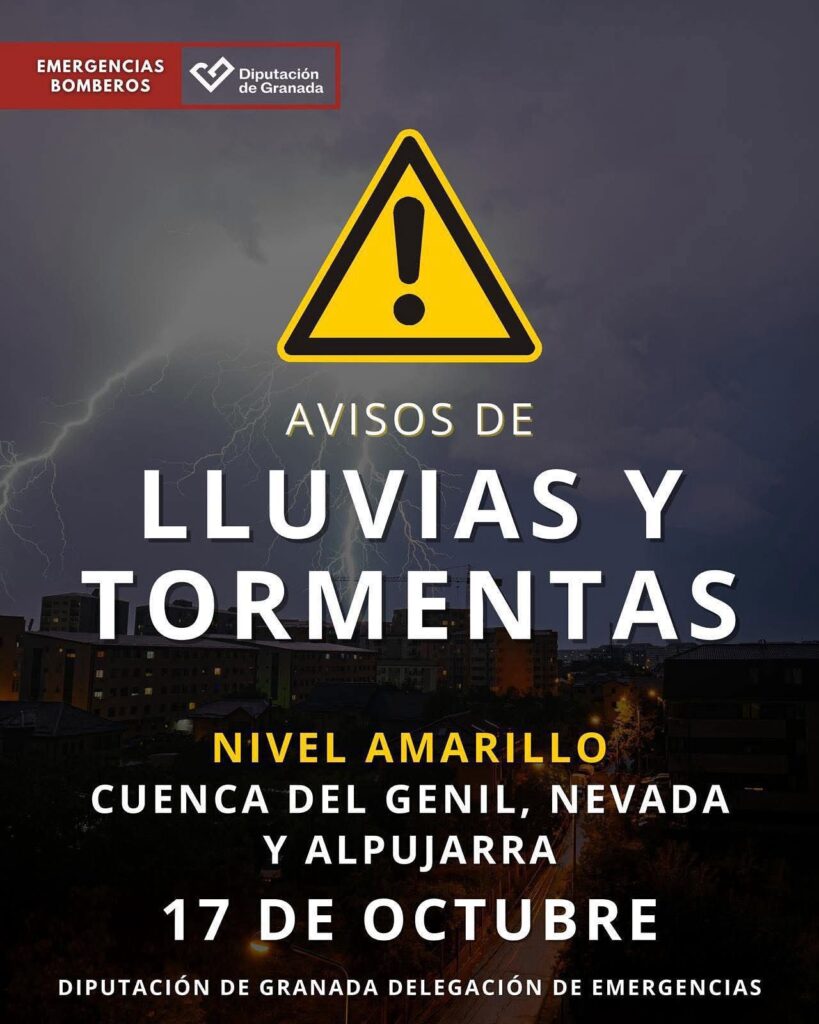 La Agencia Estatal de Meteorología (AEMET) ha activado para este viernes 17 de octubre el aviso amarillo por lluvias y tormentas en varias comarcas de la provincia de Granada, concretamente envel Valle de Lecrín, la Cuenca del Genil, la zona de Nevada y La Alpujarra.