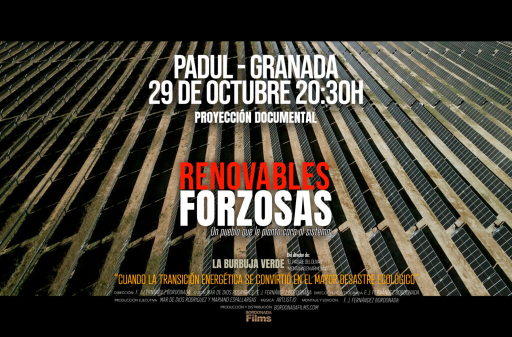 Este miércoles 29 de octubre, la Nave FEVE de Padul acogerá a las 20:30 horas la proyección en exclusiva del documental premiado “Renovables Forzosas”, una obra que ha despertado gran interés allí donde se ha estrenado por su mirada crítica y profundamente humana sobre la expansión de los macroproyectos energéticos en el medio rural.