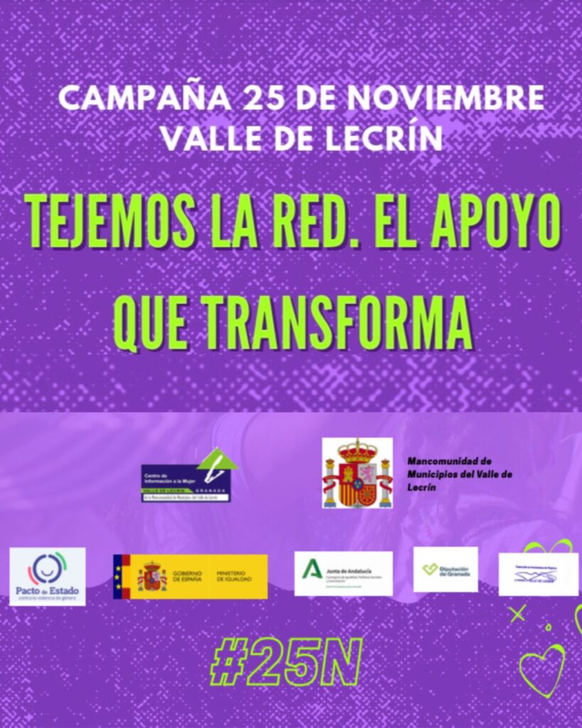 Con el objetivo de promover el apoyo mutuo frente a la violencia de género poniendo en valor la importancia del apoyo social hacia las mujeres víctimas de violencia de género, el Centro de Información a la Mujer del Valle de Lecrín (CIM), los Ayuntamientos y los centros educativos de la comarca y la delegación de Igualdad de la Diputación de Granada, ponen en marcha la campaña “Tejemos la red. Somos el apoyo que transforma” con motivo del 25N.