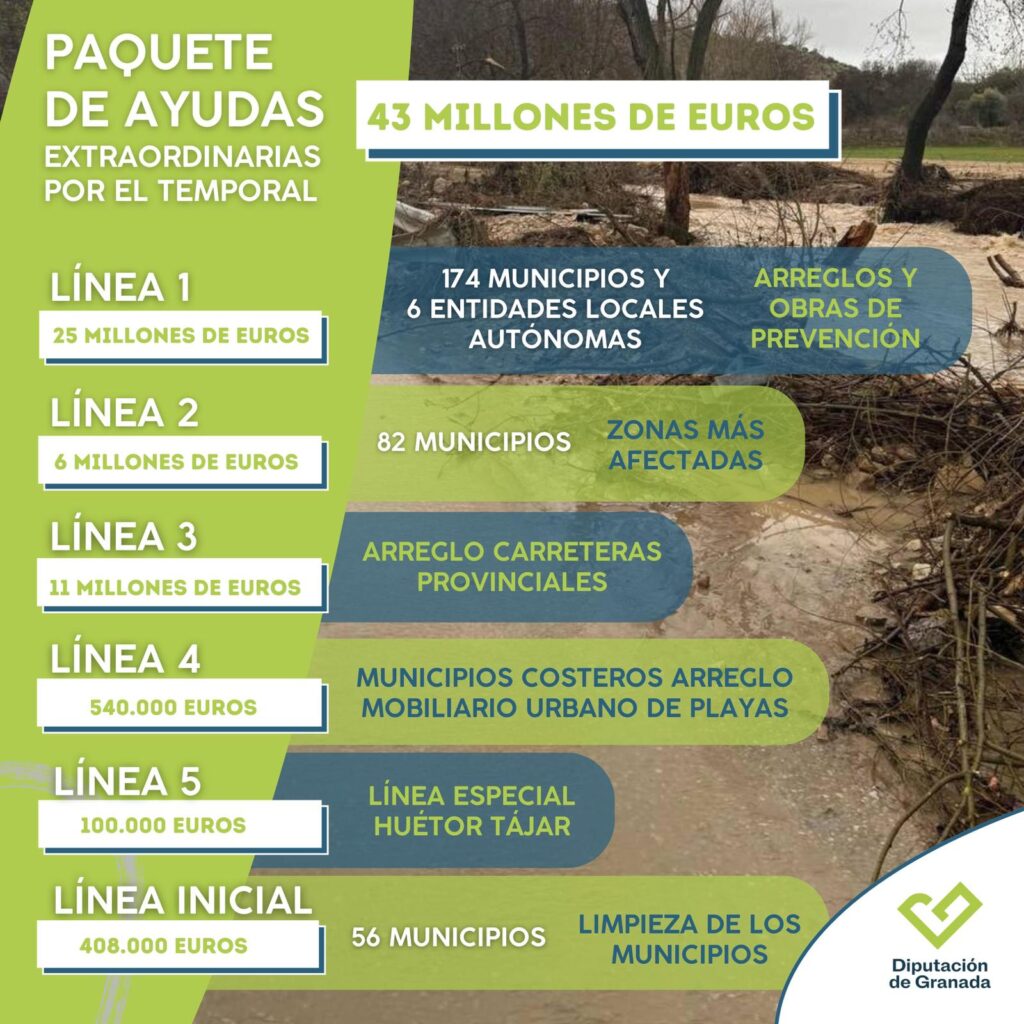 La Diputación de Granada ha elaborado un paquete extraordinario de ayudas dotado con 43 millones de euros con el objetivo de dar soporte directo a los municipios de la provincia para paliar los graves efectos del temporal registrado en las últimas semanas.
