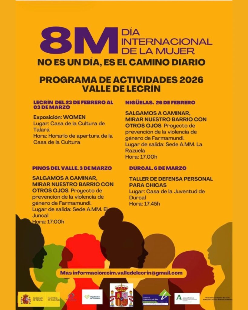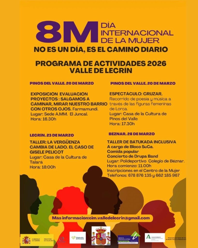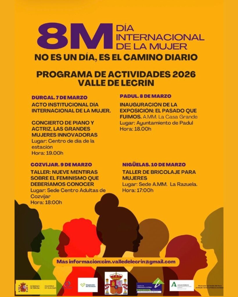El Centro de Información a la Mujer del Valle de Lecrín ha presentado la programación especial con motivo del 8 de marzo, Día Internacional de la Mujer, que se desarrollará durante todo el mes en los distintos municipios de la comarca. Bajo el lema “8M 2026: No es un día, es el camino diario”, la iniciativa apuesta por la sensibilización, la formación, la cultura y la convivencia como herramientas clave para seguir avanzando en igualdad.