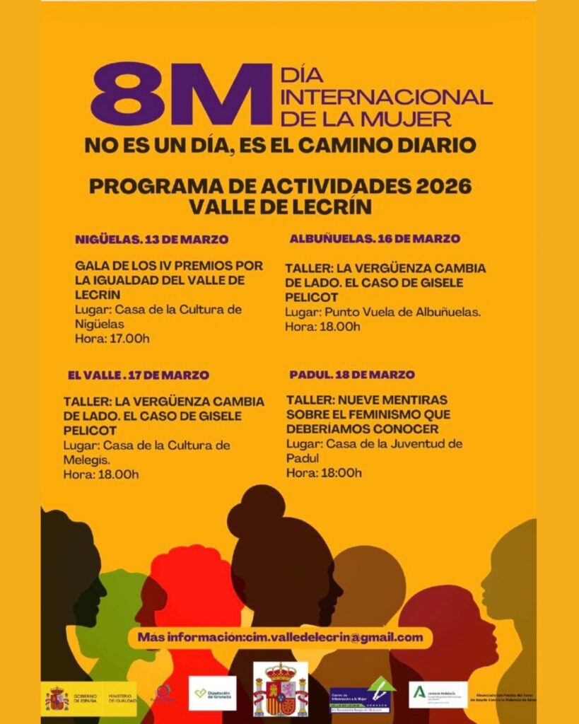 Entre las actividades programadas destacan exposiciones como WOMEN y El pasado que fuimos; talleres formativos como “Nueve mentiras sobre el feminismo que deberíamos conocer” y “La vergüenza cambia de lado. El caso de Gisèle Pelicot”; un taller de defensa personal para chicas; acciones de prevención de la violencia de género a través del proyecto “Salgamos a caminar, mirar nuestro barrio con otros ojos”, en colaboración con Farmamundi; así como actos institucionales, espectáculos culturales, conciertos y la celebración de los IV Premios por la Igualdad del Valle de Lecrín el 13 de marzo en Nigüelas.