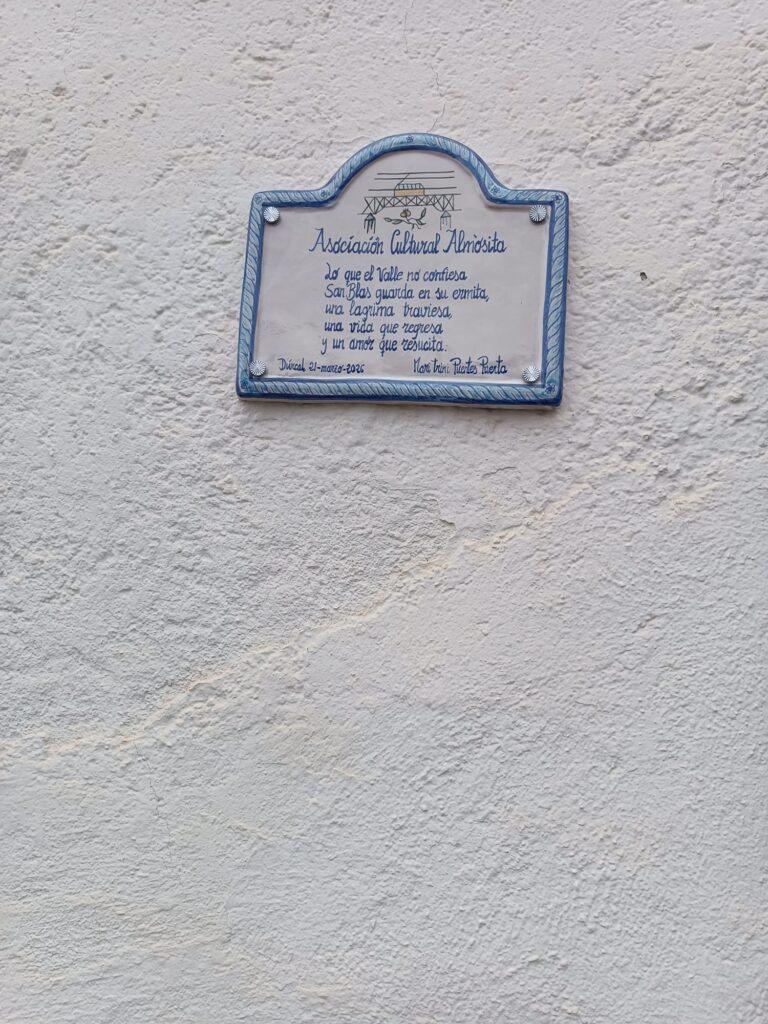 Frente a la ermita de San Blas, la placa escrita por Mari Trini Puentes Puerta reza así: “Lo que el Valle no confiesa San Blas guarda en su ermita, una lágrima traviesa, una vida que regresa y un amor que resucita”.