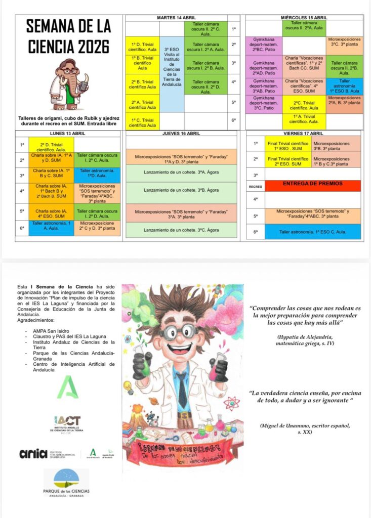 La actividad ha sido organizada por los integrantes del Proyecto de Innovación “Plan de impulso de la ciencia en el IES La Laguna” y financiada por la Consejería de Educación de la Junta de Andalucía. Asimismo, el centro ha contado con la colaboración de diversas entidades como el AMPA San Isidro, el Parque de las Ciencias de Granada y el Centro de Inteligencia Artificial de Andalucía y al Instituto Andaluz de Ciencias de la Tierra.